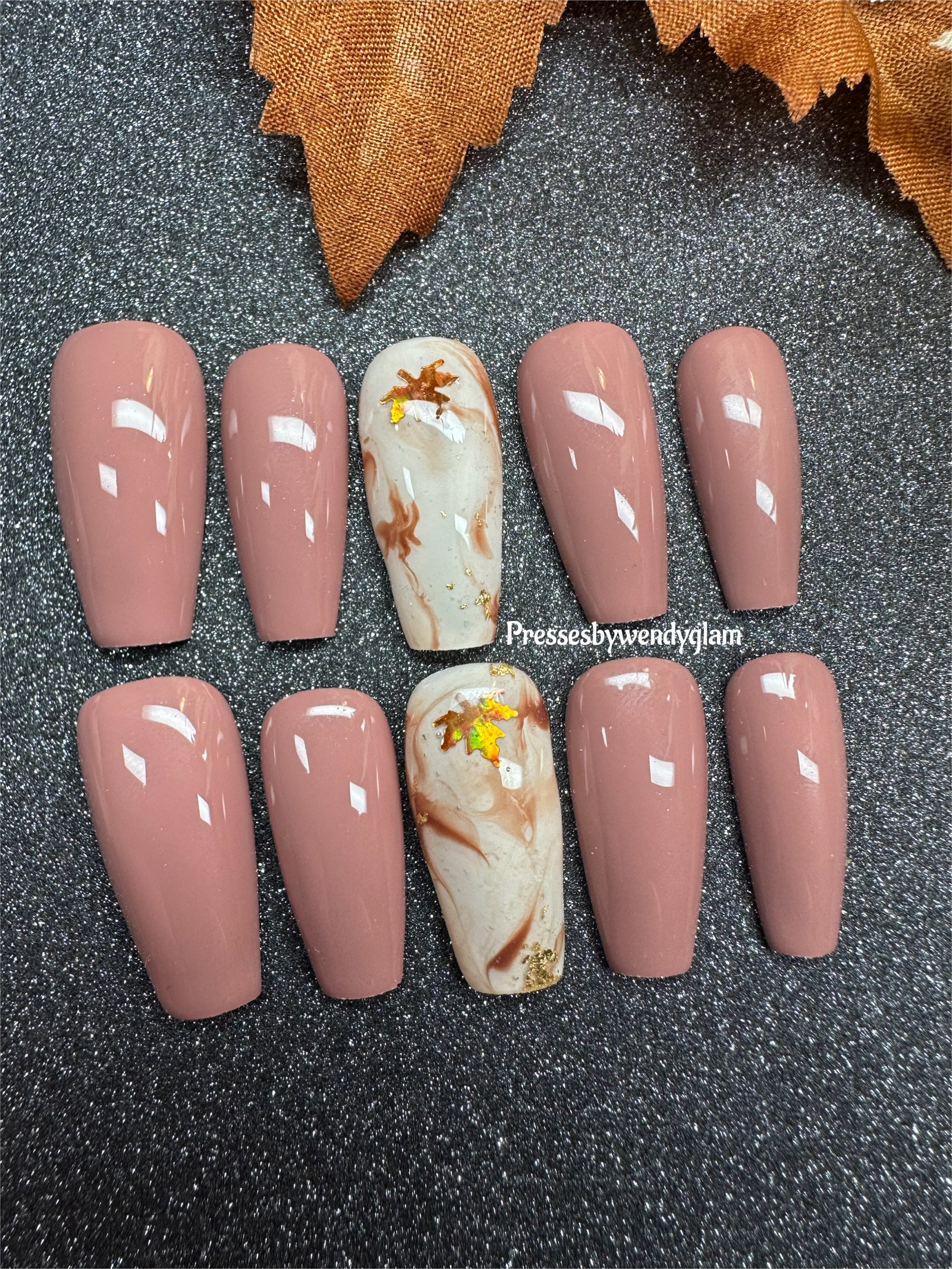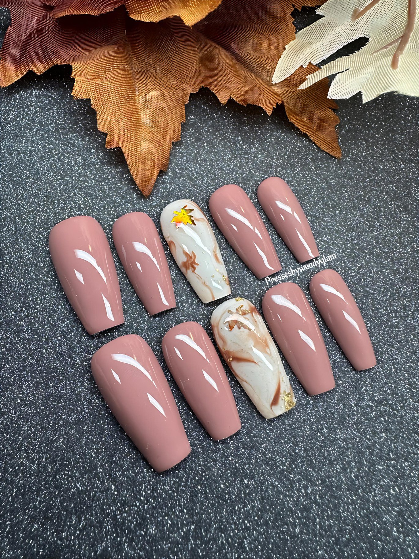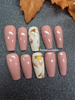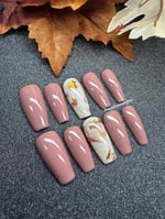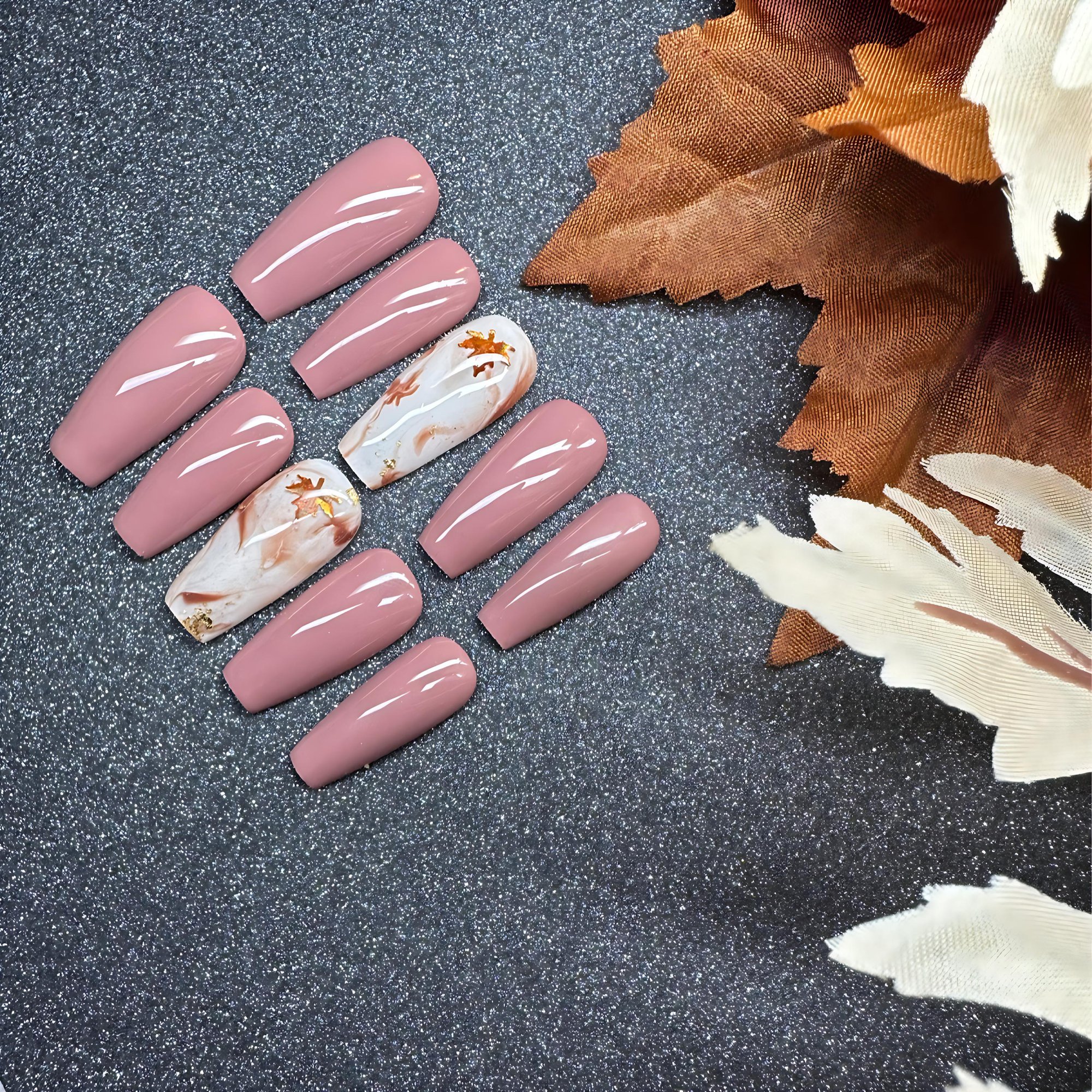 This elegant set blends warm rose-mauve tones with creamy marble accent nails, swirled in cinnamon hues and topped with shimmering foil leaves. A perfect nod to fall, giving cozy, seasonal vibes with a touch of golden glam