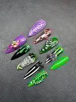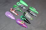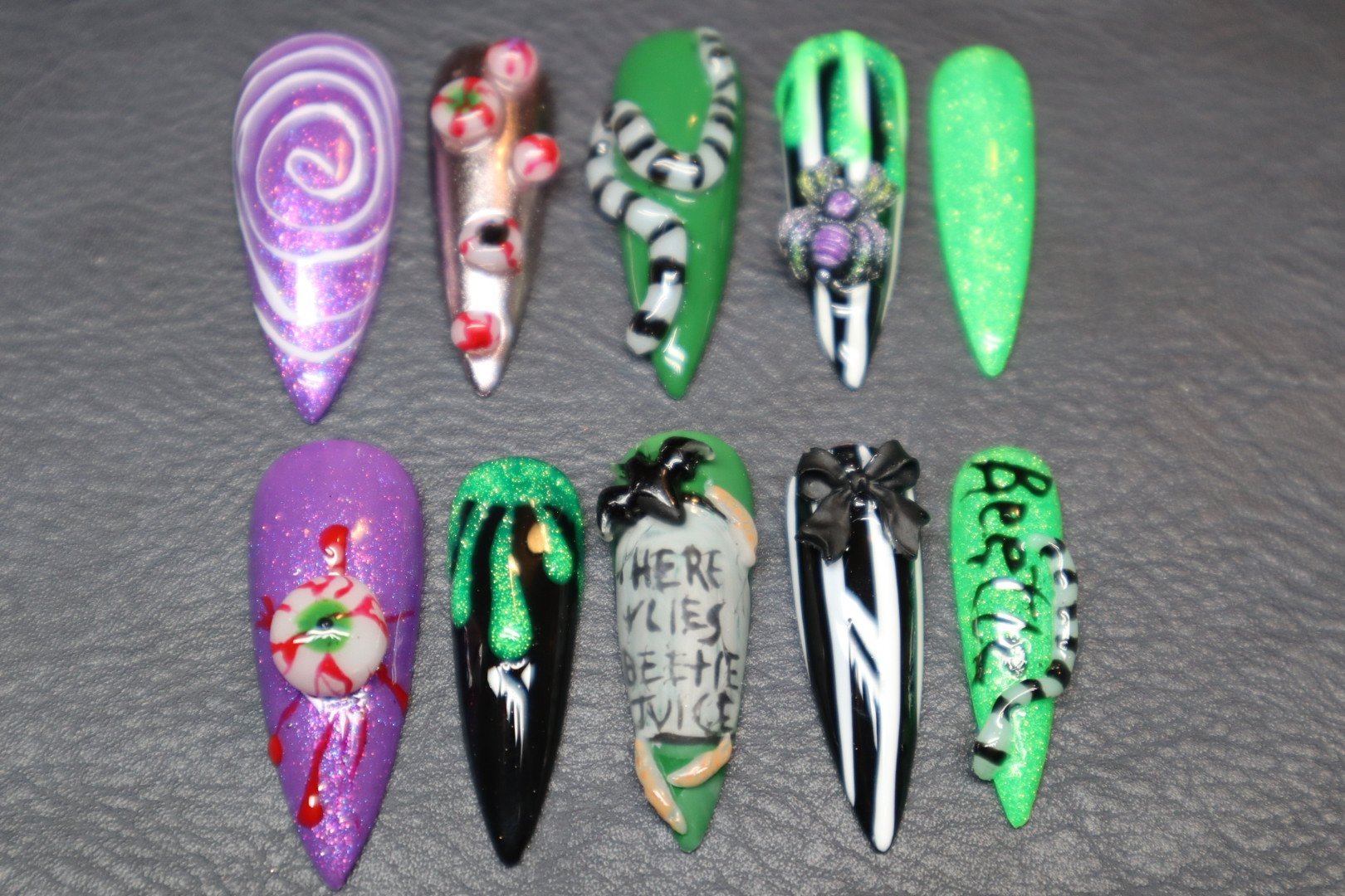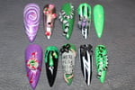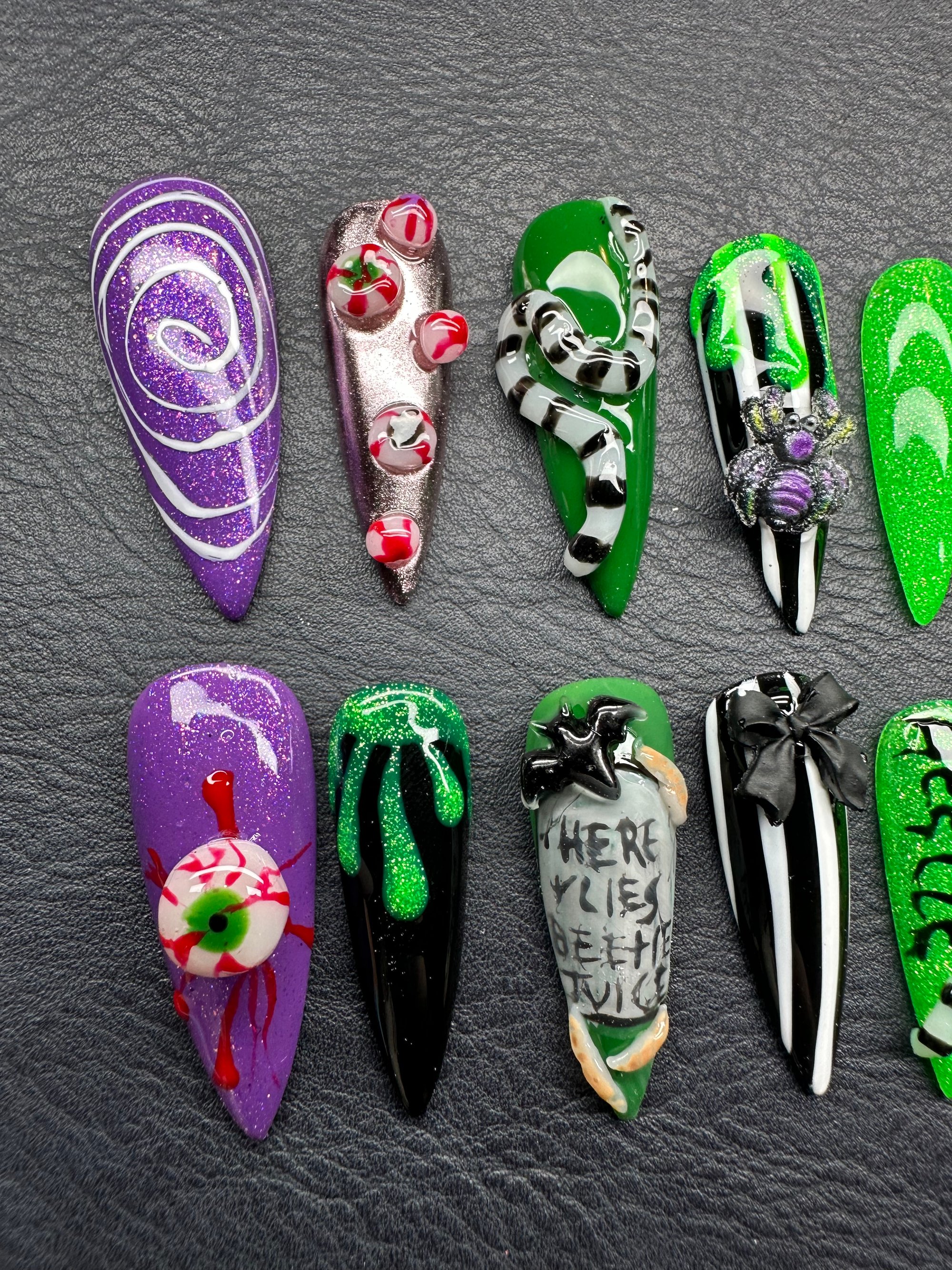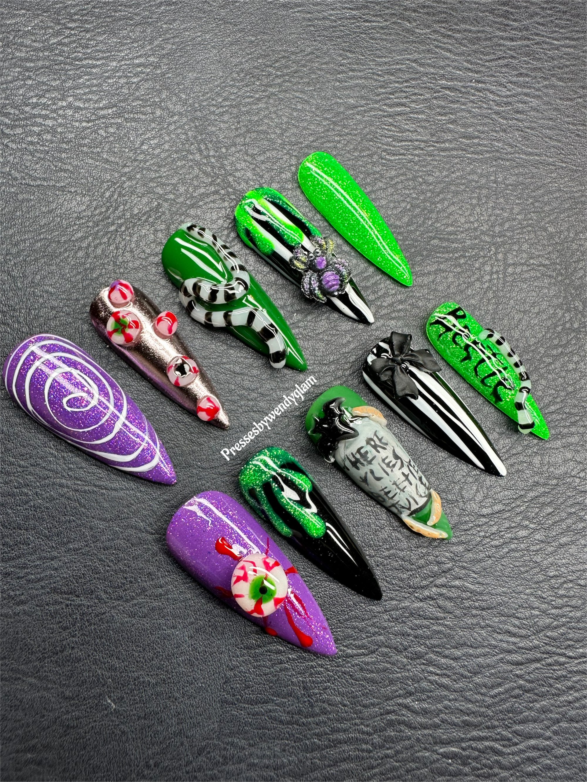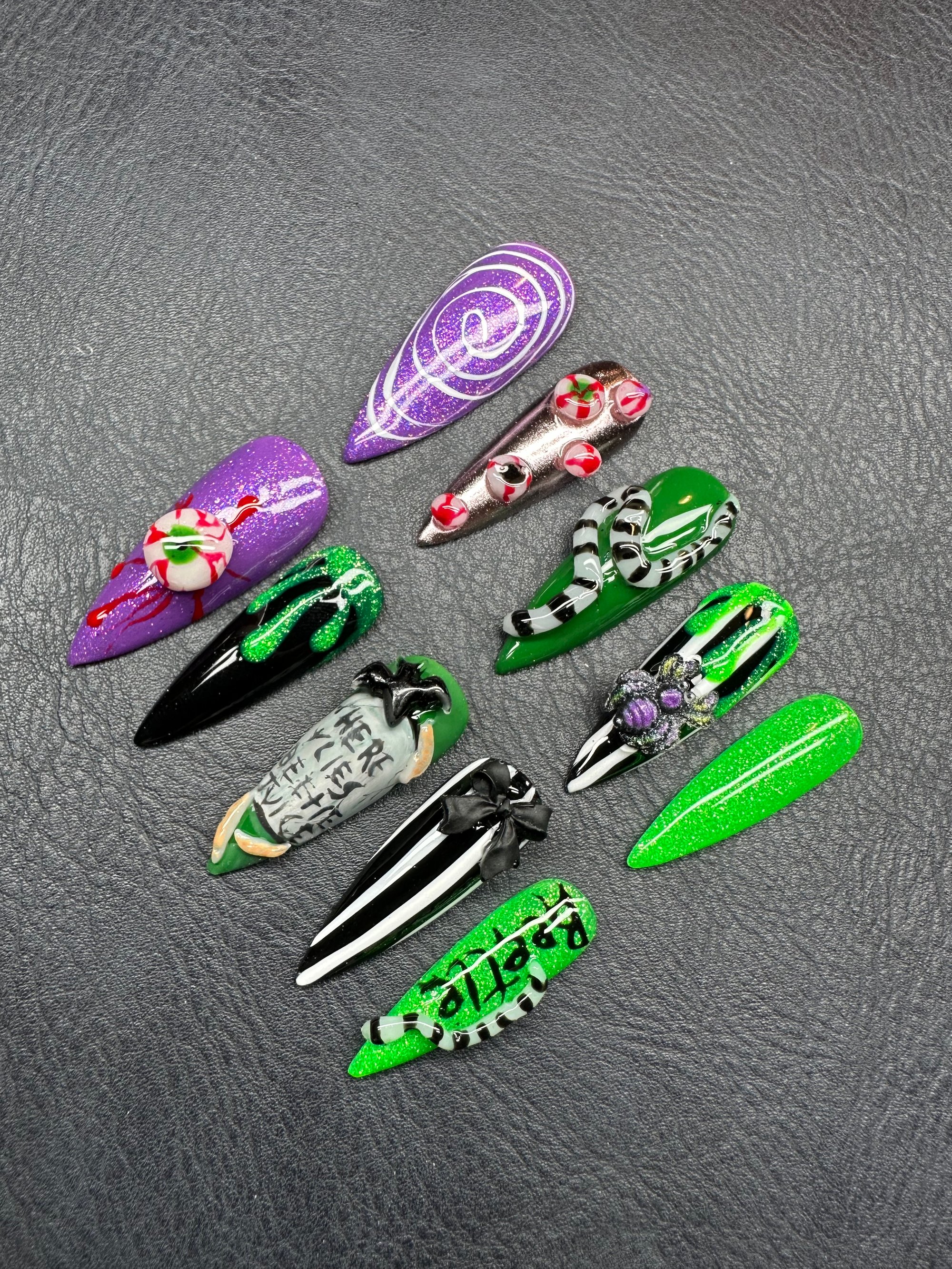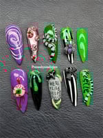 A spooky-chic press-on set featuring bold greens, purples, and blacks with creepy 3D accents like snakes, spiders, tombstones, and eerie eyeballs. Perfect for Halloween or any witchy, haunted vibe