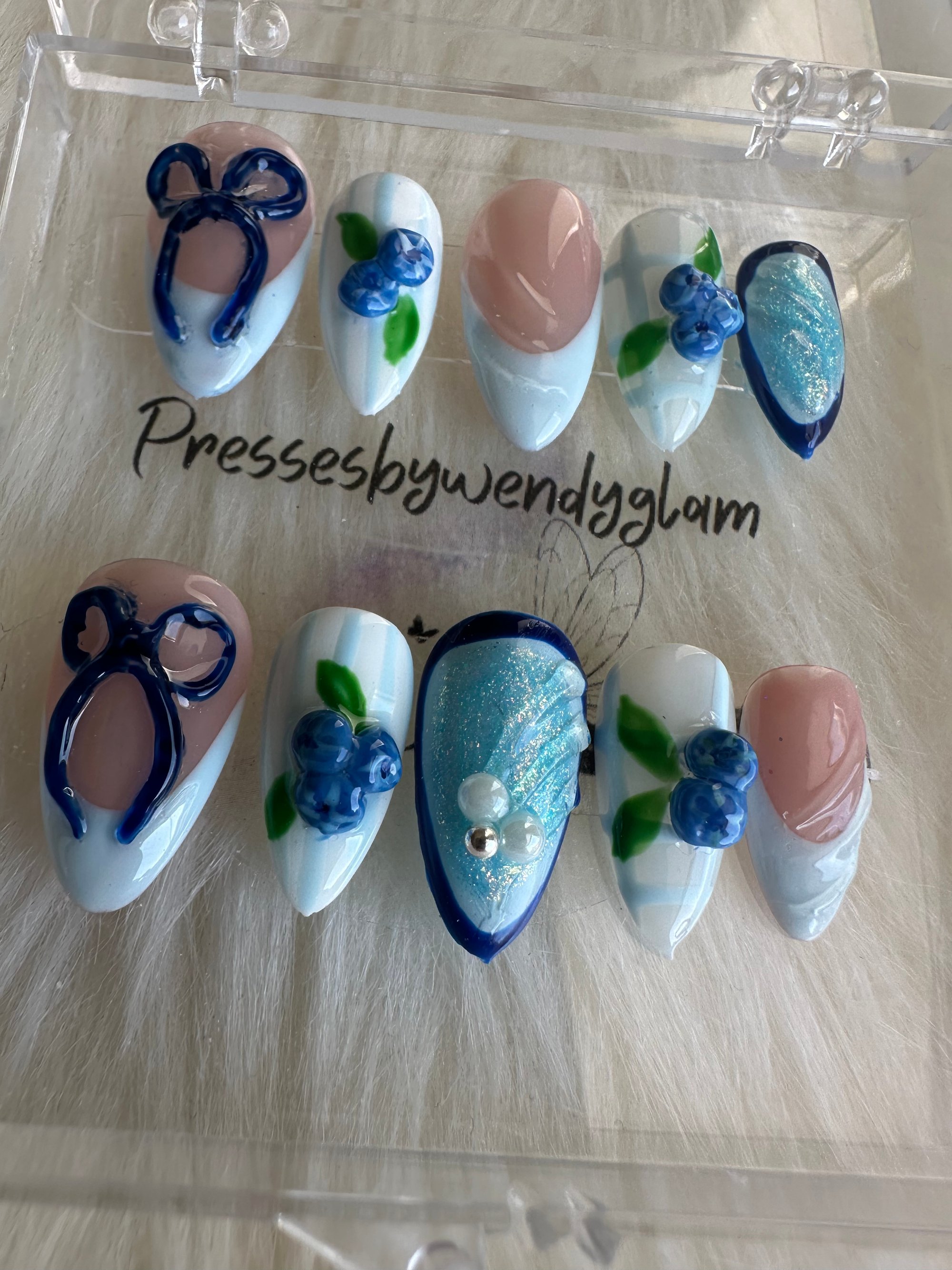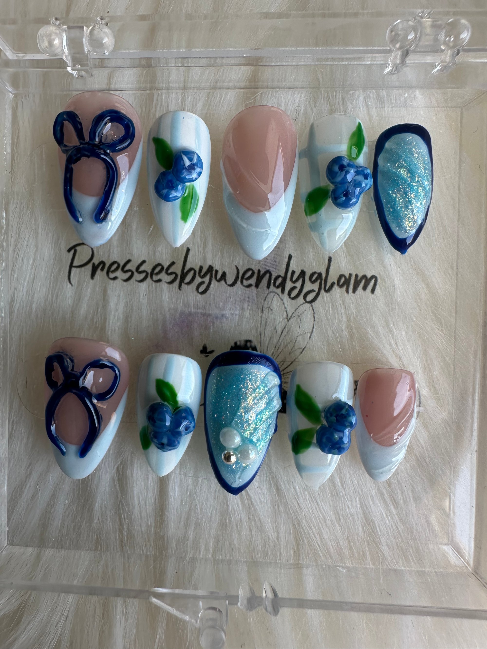 Soft baby-blue base with juicy blueberry accents, leafy details, and glossy shimmer for a sweet, fresh finish.