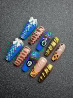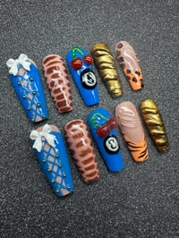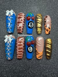 This eclectic press-on nail set is a fierce fusion of bold textures, wild prints, and playful accents. Featuring vibrant electric blues with corset lacing and 3D bows, sultry mocha wave patterns, fiery gold metallics, and eye-catching 8-ball cherry art, each nail tells its own story. From safari-inspired spots to untamed tiger stripes, this set is perfect for the trendsetter who’s not afraid to mix edgy, cute, and glam all in one look. Ideal for statement-making moments or switching up your vibe with every wear.