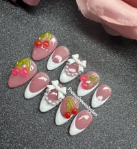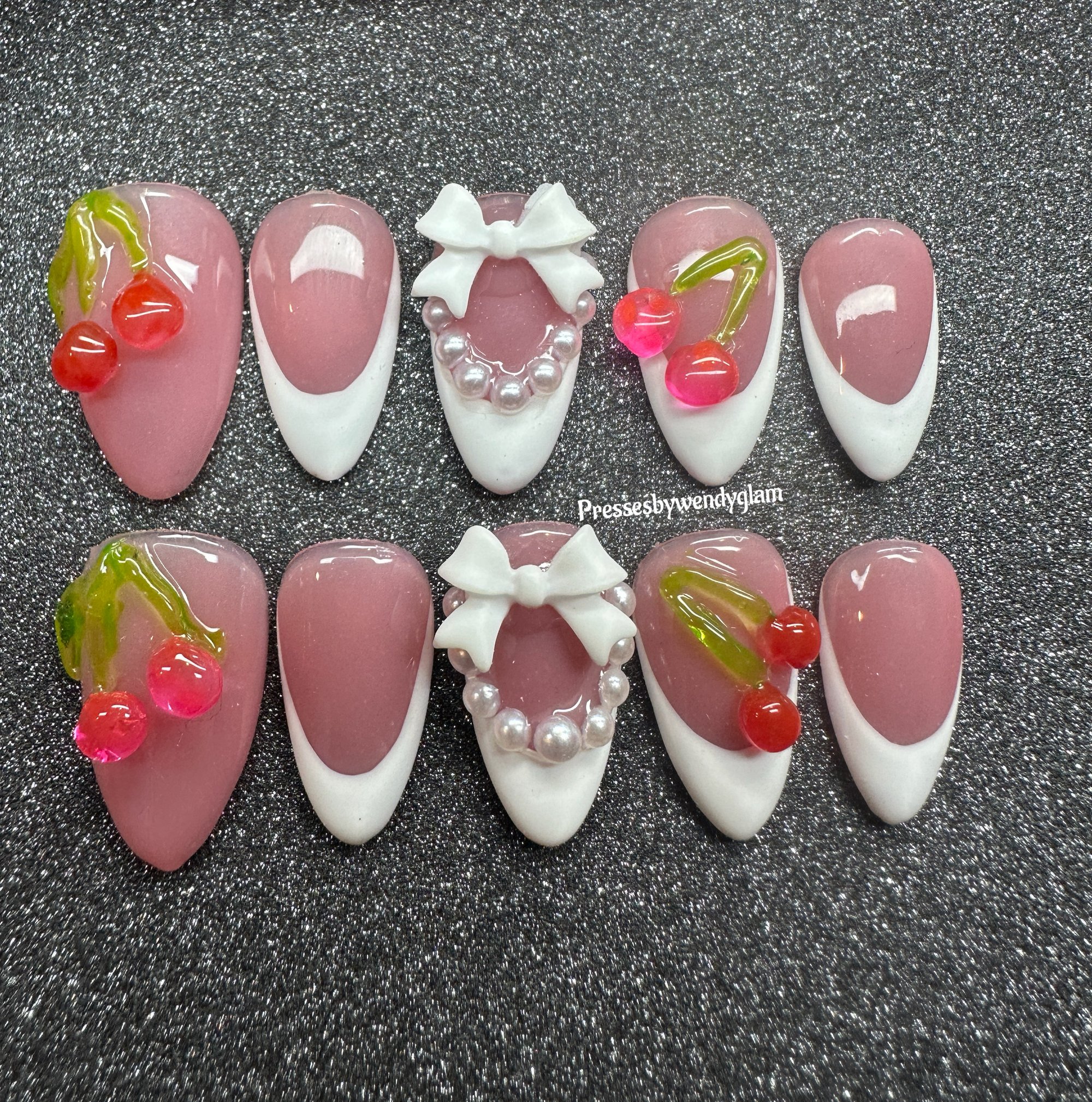 A playful mix of elegance and sweetness—Cherry Luxe features glossy pink bases with crisp white French tips, topped with juicy 3D cherry charms, dainty pearls, and delicate bows for a glam, girly vibe. Perfect for turning heads this summer!