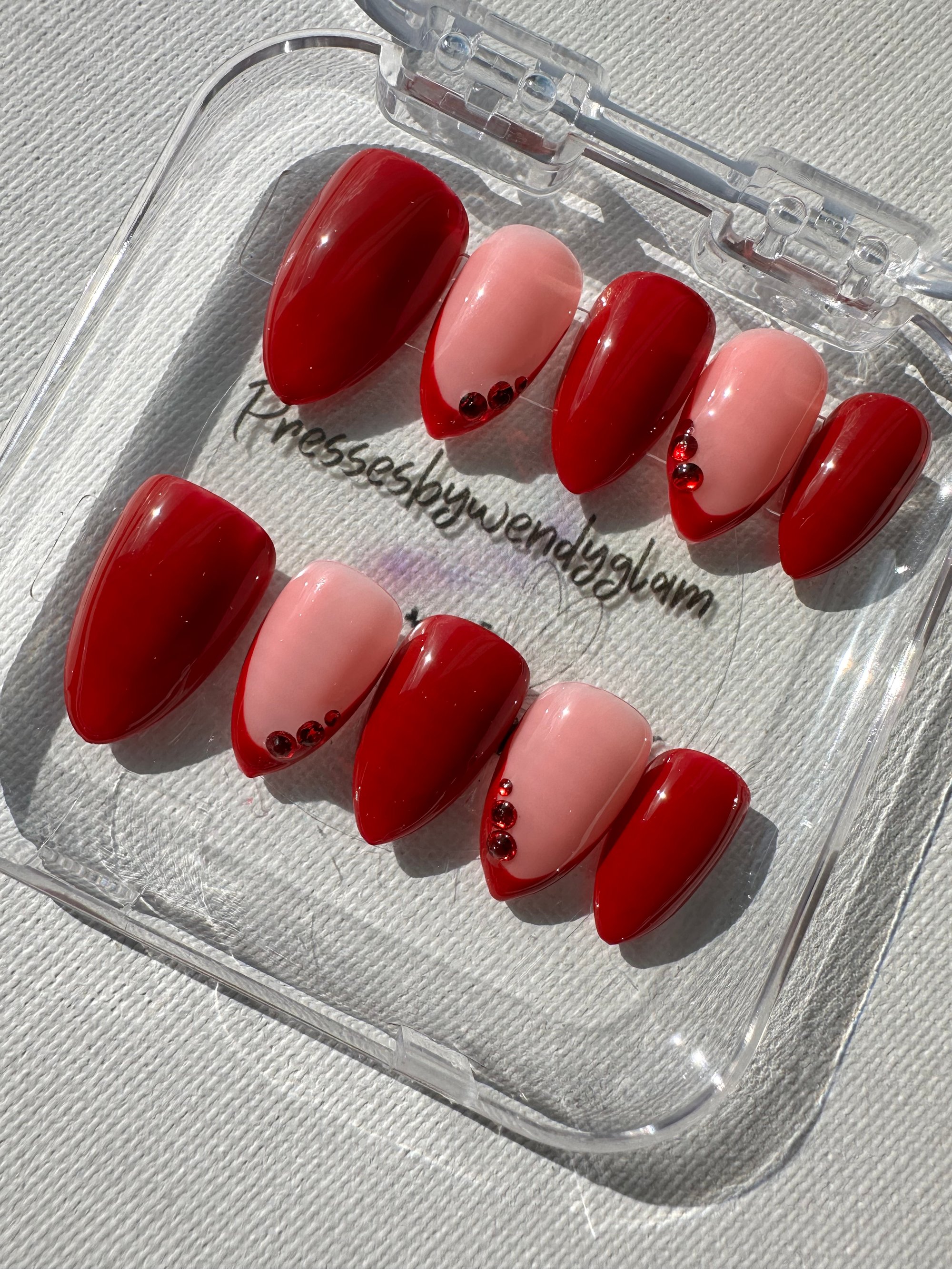 Sleek glossy cherry-red nails paired with soft blush accents, featuring curved French-style tips and sparkling red rhinestones for a bold yet elegant, date-night vibe.