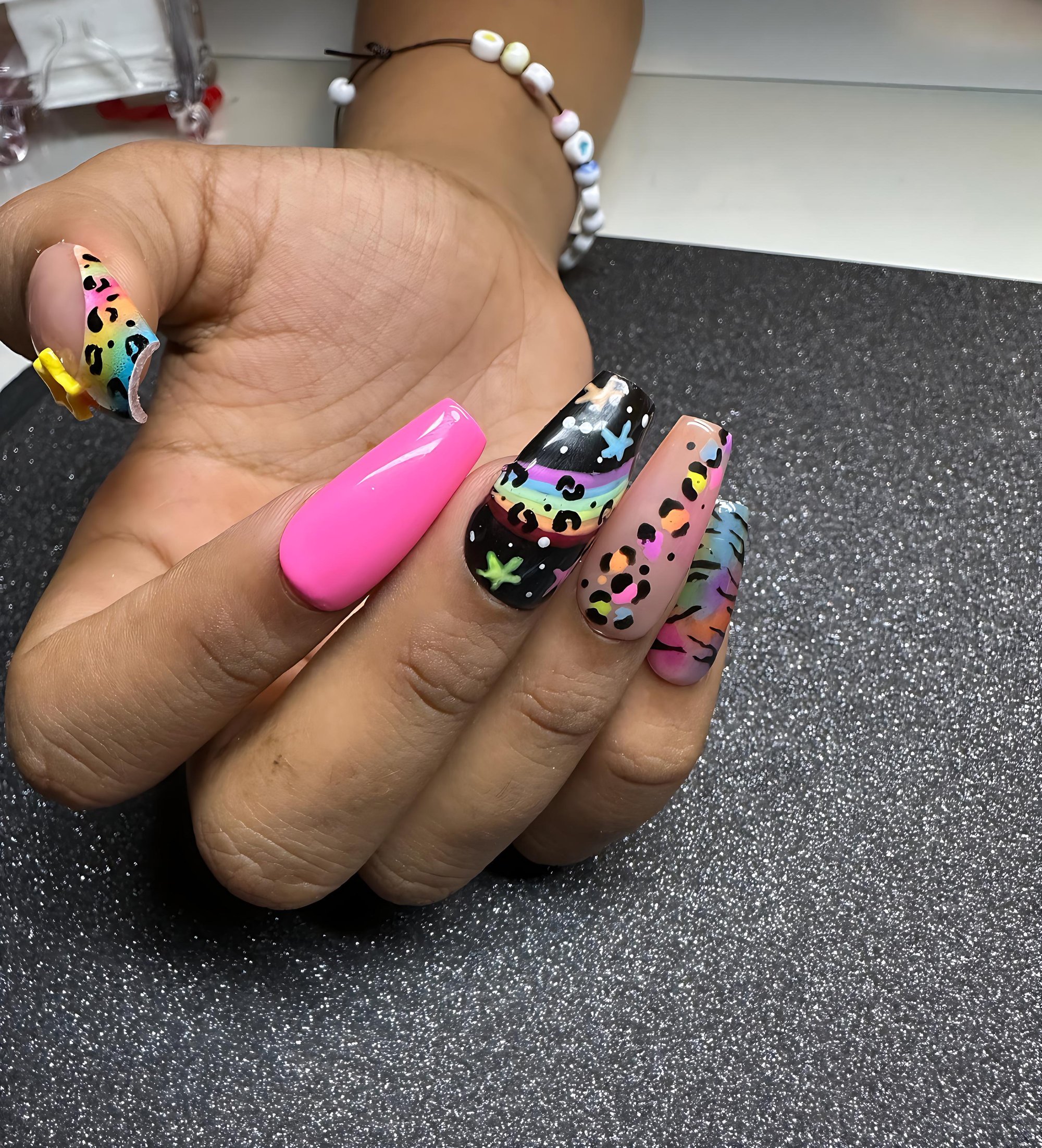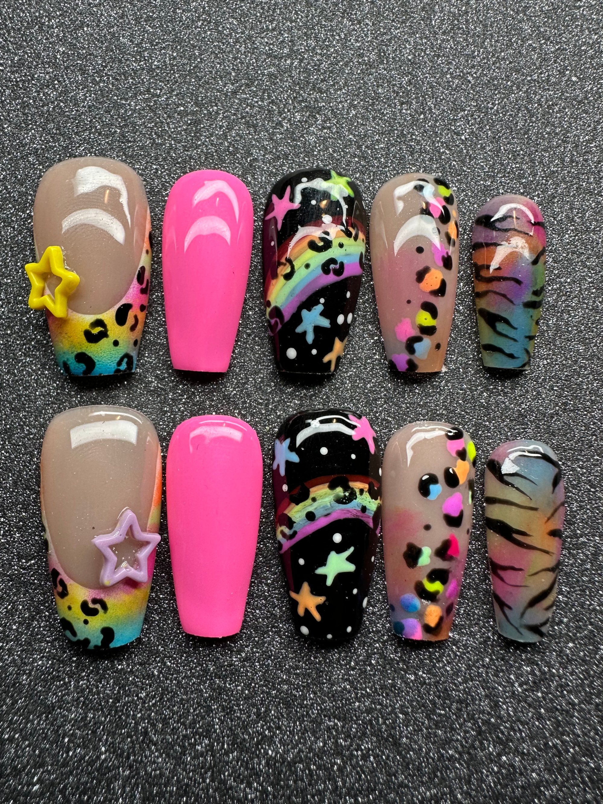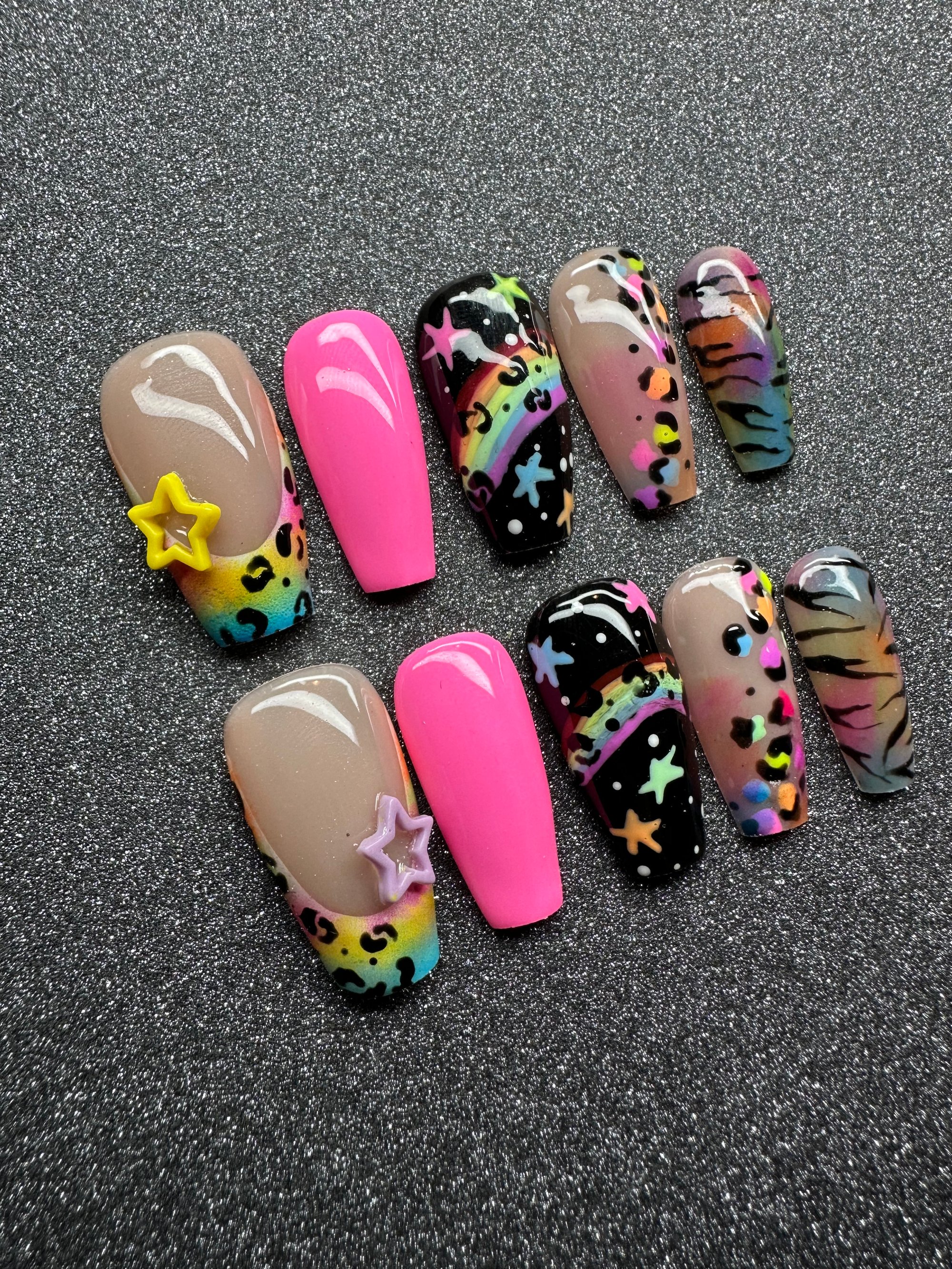 Bold, wild, and totally out of this world blends rainbow leopard prints, neon pink, zebra stripes, and galaxy vibes with 3D star charms for a fierce, fun, and fearless look. Perfect for the baddie who lives in color.