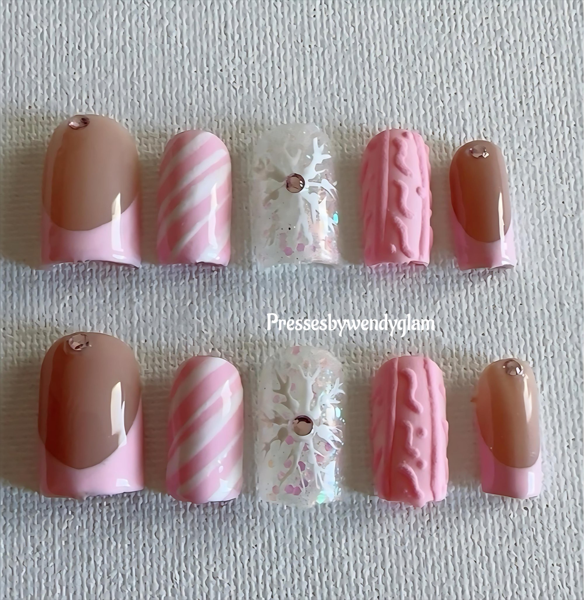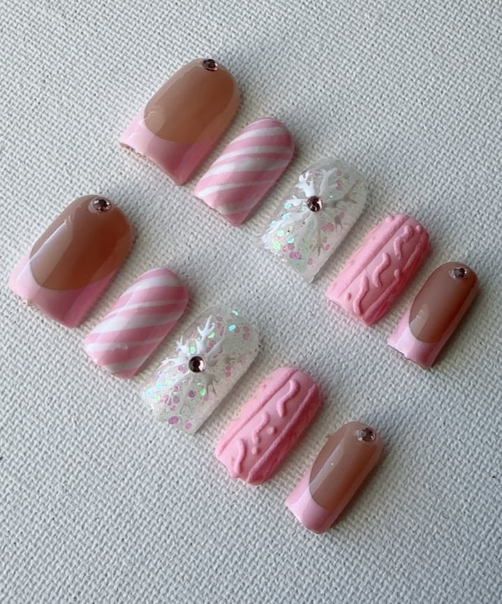 A cozy-chic winter set featuring soft pink candy stripes, nude French tips with crystals, glittery snowflakes, and 3D cable-knit texture. Perfect for a sweet and stylish holiday vibe