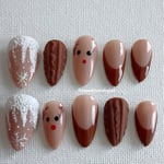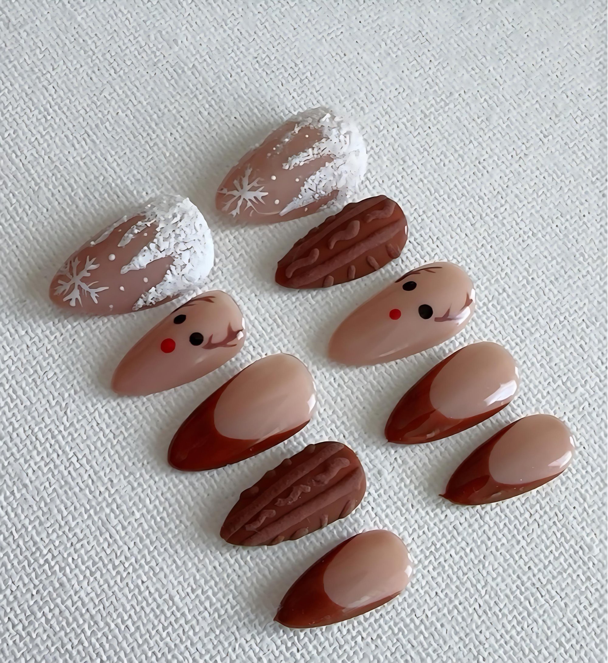 A cozy winter inspired press-on set featuring soft nude and warm brown tones with adorable reindeer faces, sweater-knit textures, frosty snowflakes, and icy white tips. Perfect for bringing festive cheer and cozy holiday vibes to your nails all season long