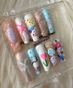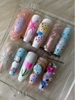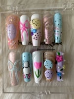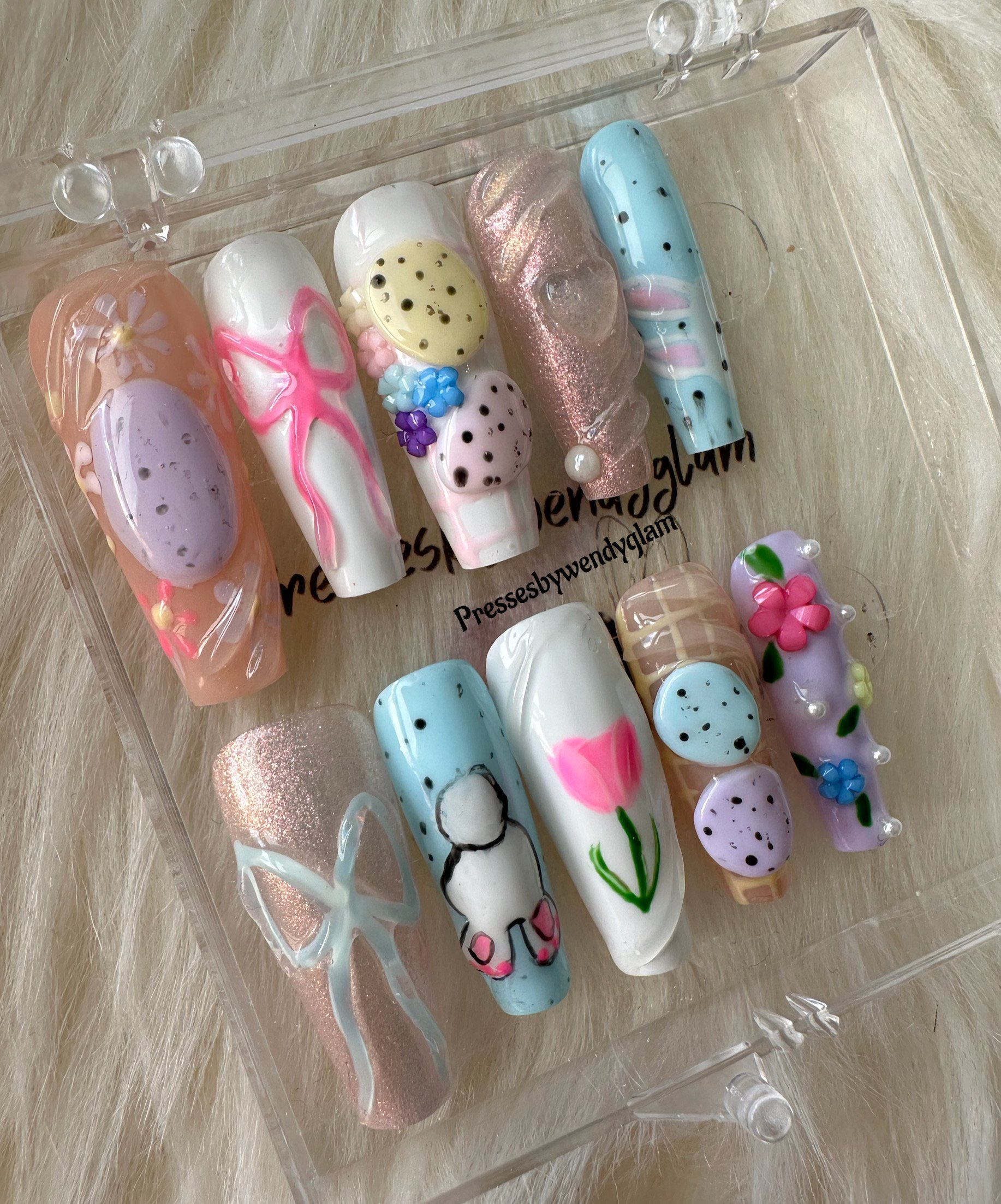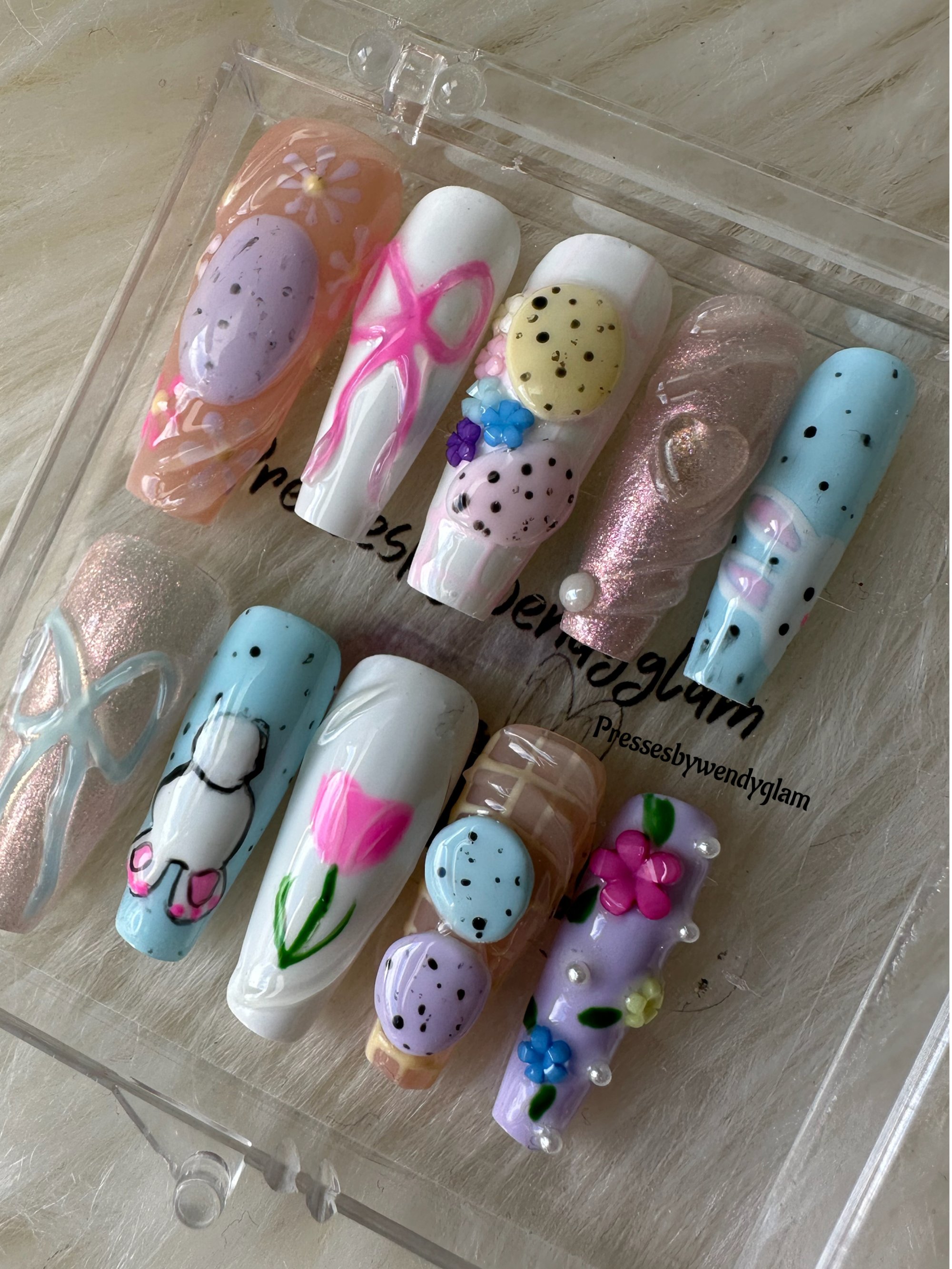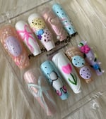 A soft Easter-spring inspired set featuring pastel blues, lilacs, peaches, and milky whites. Delicate florals, sweet bows, speckled egg details, and subtle shimmer come together for a playful yet elegant look perfect for celebrating springtime, Easter vibes, and fresh new beginnings.