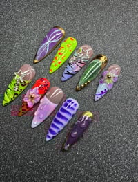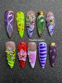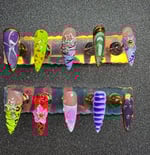 This vibrant press-on set is a bold fusion of styles, textures, and colors. With a dazzling mix of neon greens, purples, and hot orange each nail tells its own story—ranging from glittery galaxy swirls and 3D floral blooms to animal prints, abstract stripes, and jewel embellishments. Perfect for those who love maximalist, artsy nail vibes with an edgy twist, this set is all about standing out and having fun with every fingertip.