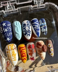 Cozy up in Stars Hollow with this Gilmore Girls inspired press-on set Featuring Luke’s Diner, Dragonfly Inn, Yale pride, fall leaves, cozy sweater textures, and coffee bean details
