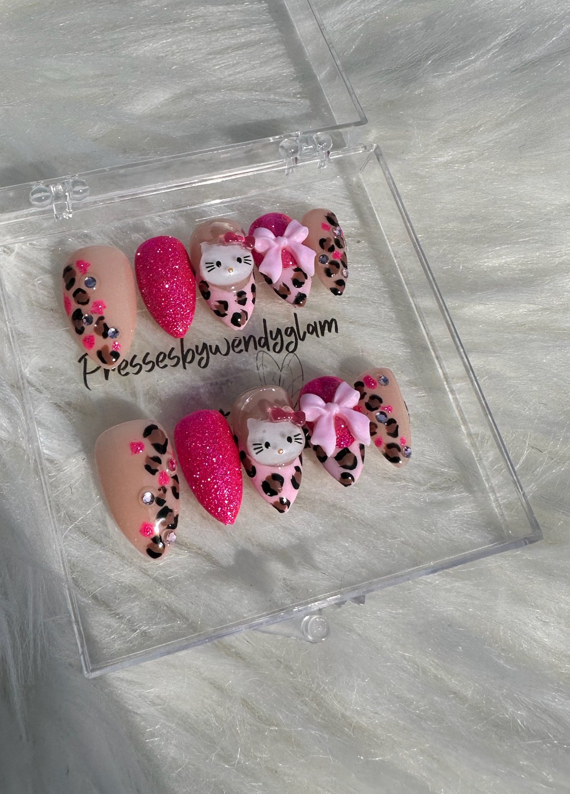 A playful glam press-on set featuring nude leopard prints, hot pink glitter accents, rhinestone details, and an adorable Hello Kitty centerpiece with a soft bow cute, bold, and perfect for little hands that love sweet, playful nails.