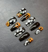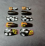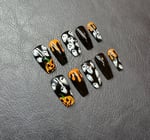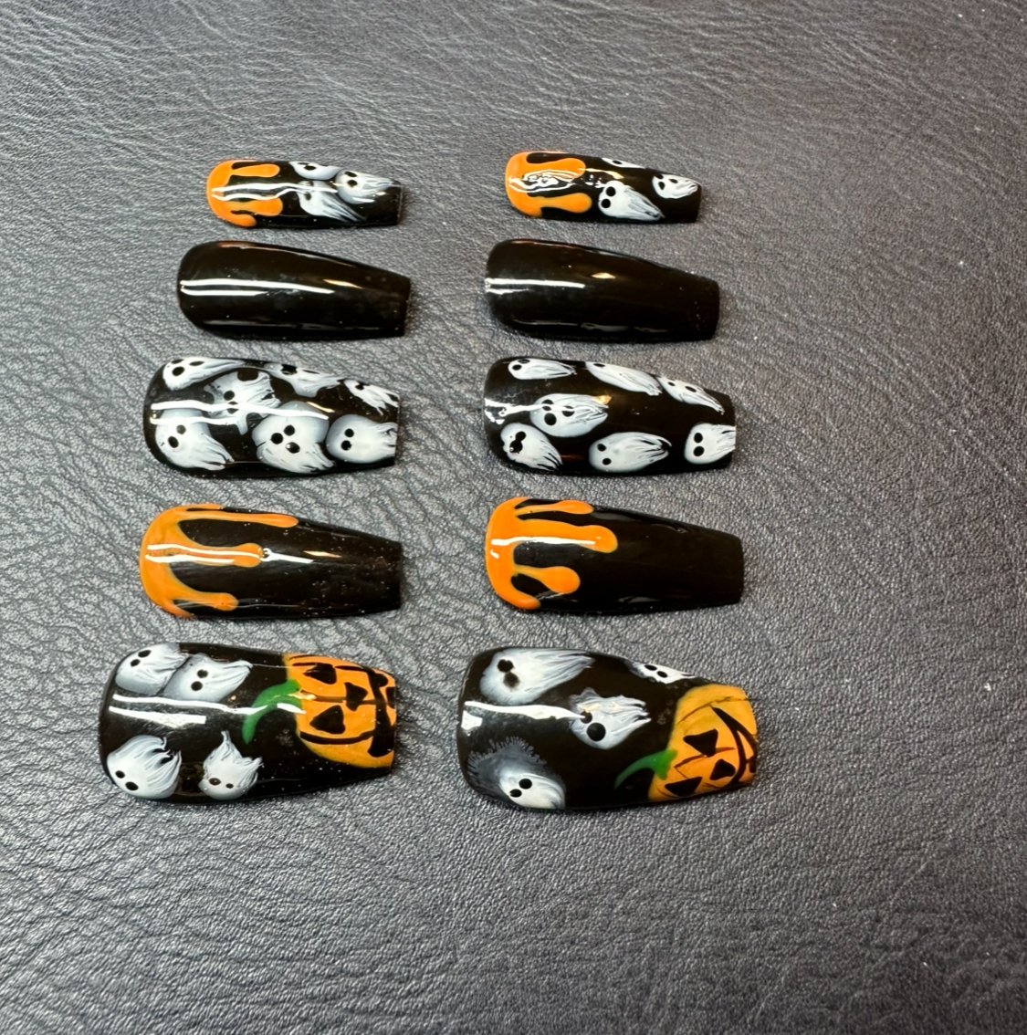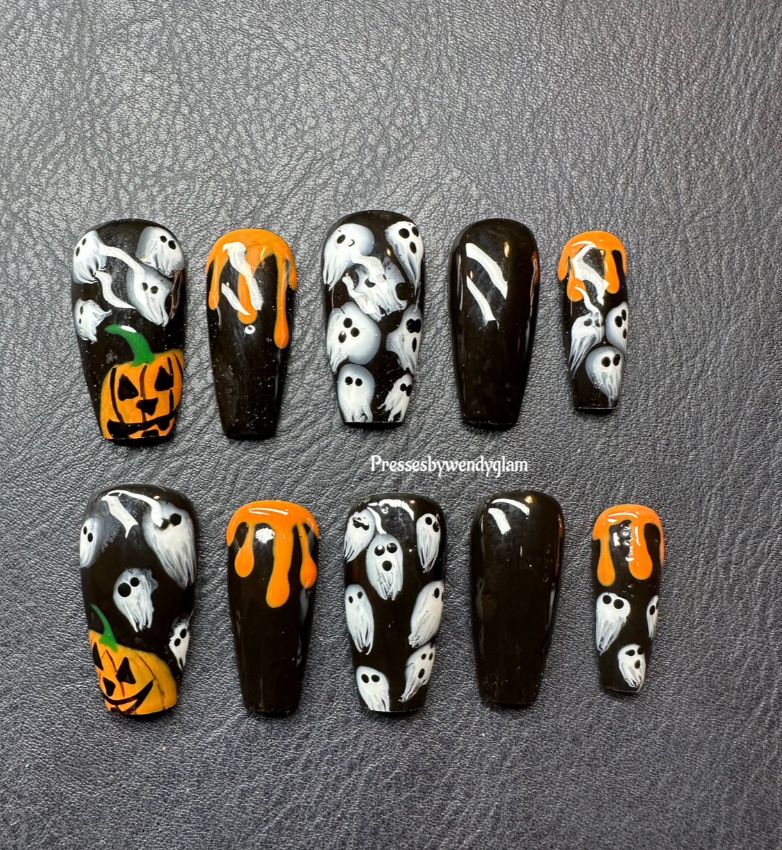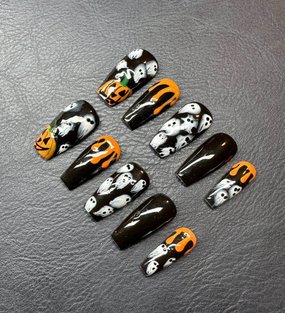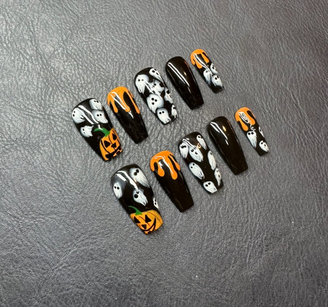 This spooky set features a glossy black base with playful white ghost designs, glowing jack-o’-lantern accents, and bold orange drip details. Perfect for Halloween vibes with a mix of eerie and fun!
