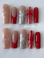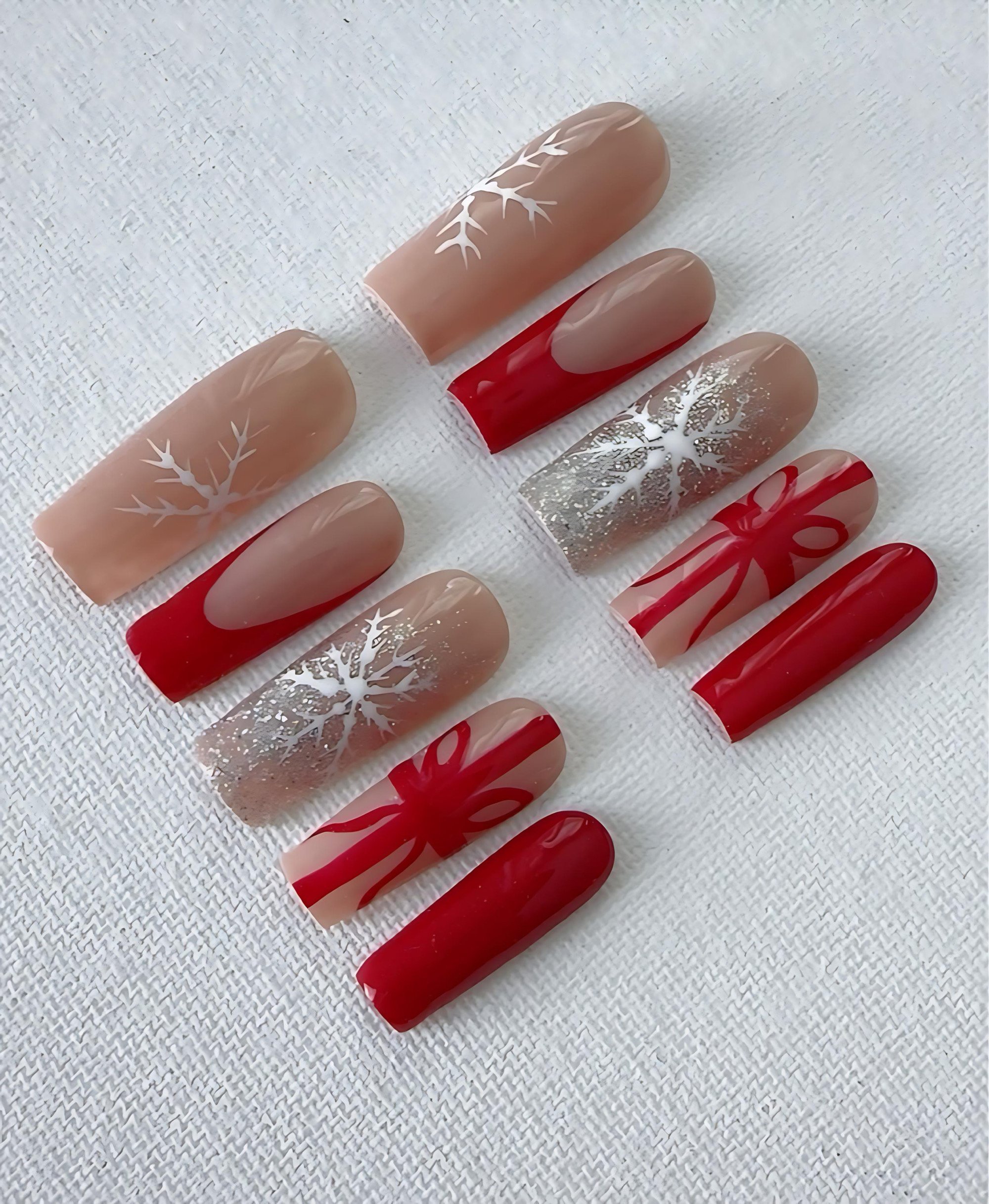 A chic festive nail set combining nude and bold red tones with shimmering silver accents. Featuring hand-painted snowflakes, glitter gradients, and delicate gift bow designs, these press-ons capture the magic and sparkle of the holiday season in every details