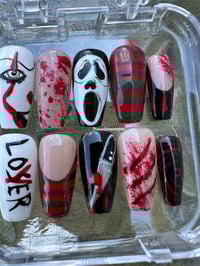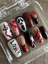 Spooky Horror Icons Press-On Set a killer mix of bloody splatters, Freddy stripes, Ghostface, and chilling details. Perfect for Halloween or horror lovers who want to slay in style