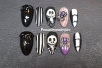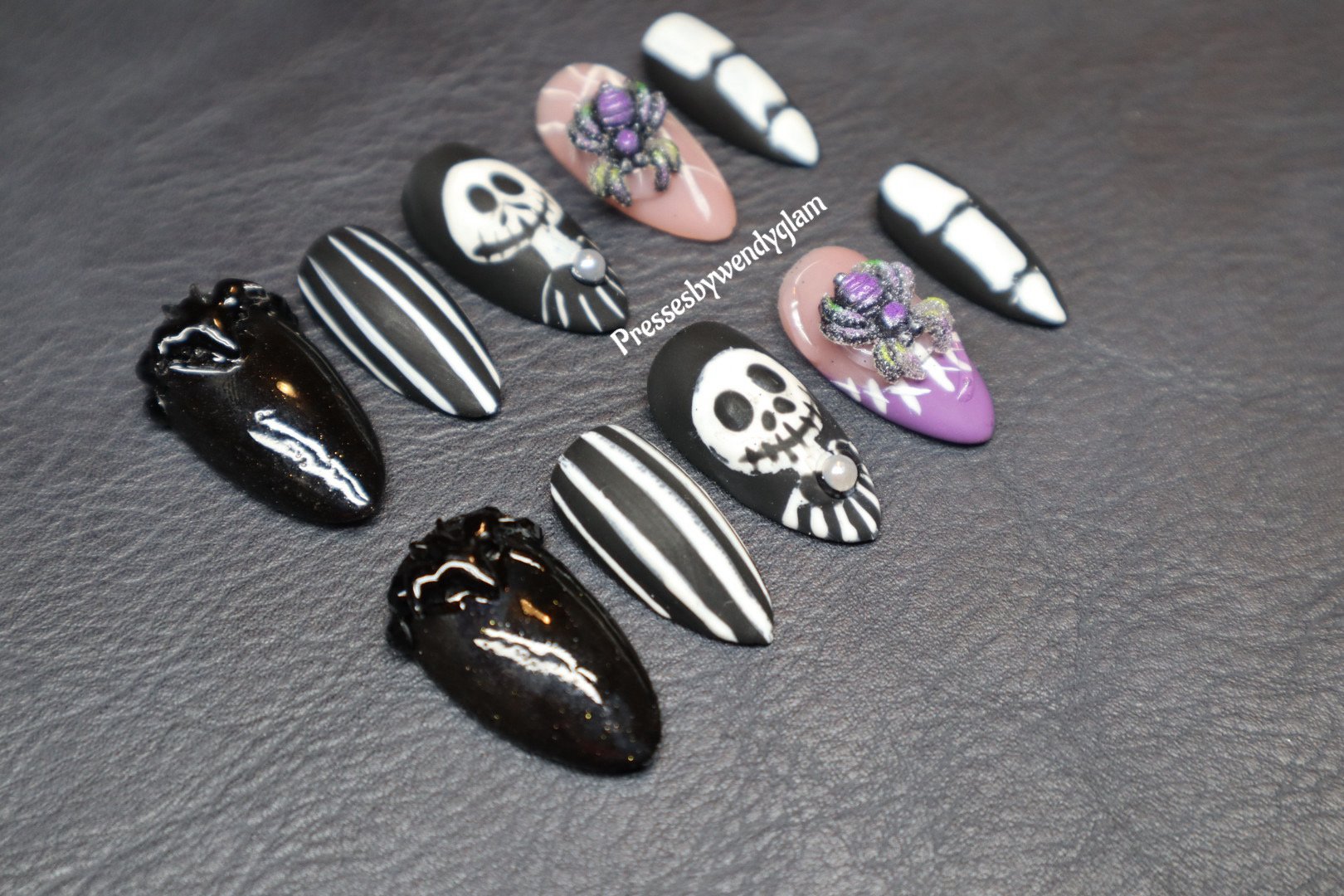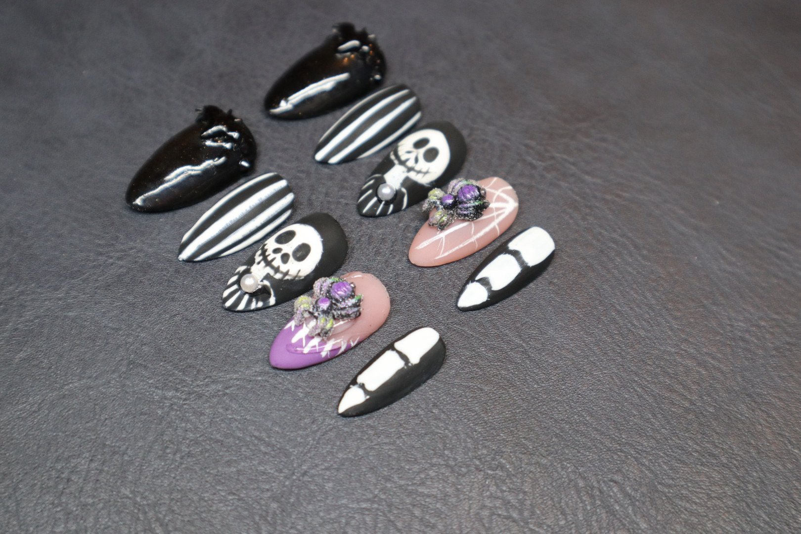 This spooky-chic press-on set is inspired by The Nightmare Before Christmas with a haunting twist. Featuring hand-painted Jack Skellington faces, eerie black glitter hearts, striped suits, stitched designs, and 3D spooky spiders over webs, this set blends gothic glam with Halloween magic. Perfect for any ghoul who’s ready to slay Halloween in style.