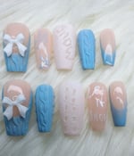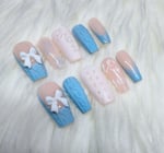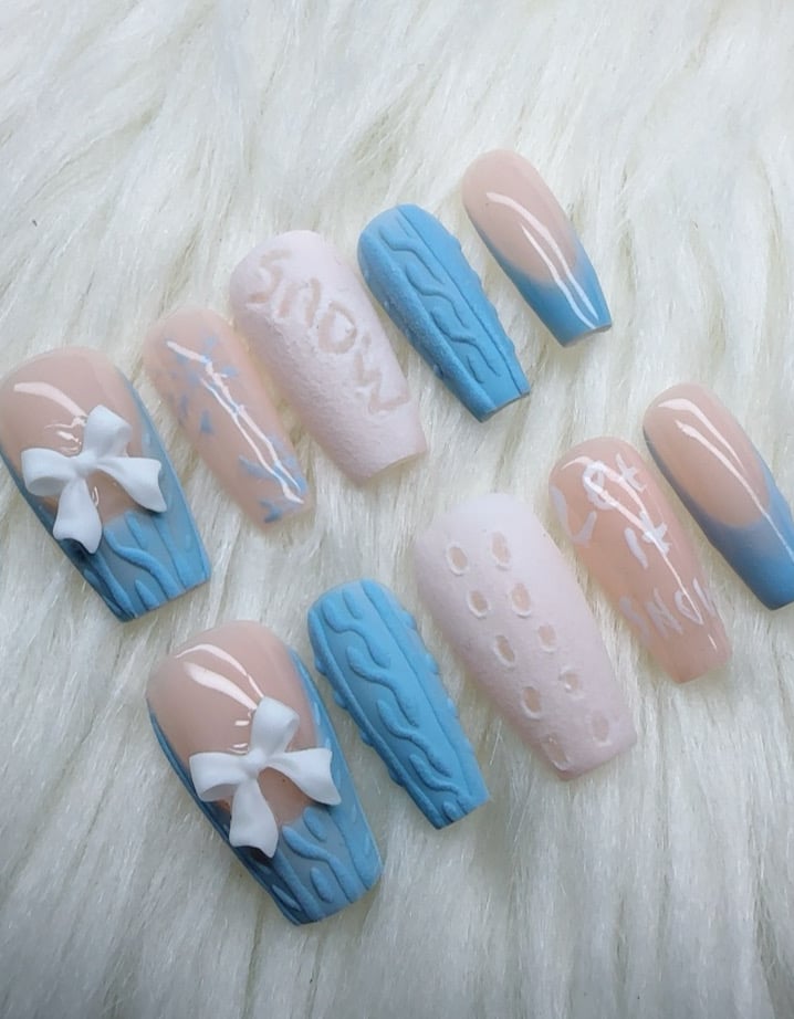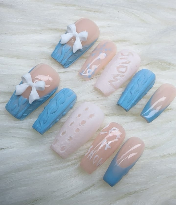 Soft winter press-ons with baby blue and blush tones, raised sweater-knit details, 3D bows, and handwritten “Snow” accents giving a cozy, cute, and frosty winter style.