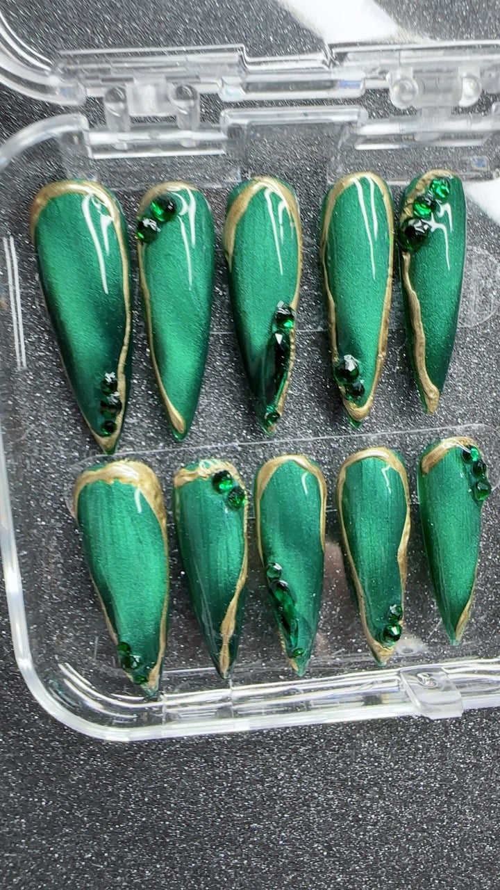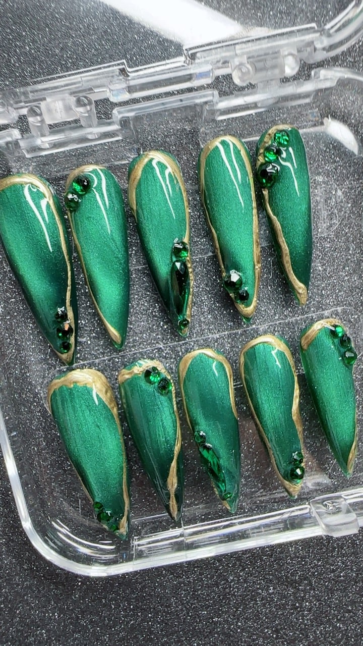 Celebrate the New Year in style with these striking press-on nails featuring a rich metallic emerald green base, outlined in glimmering gold. Accented with sparkling green gems, this set captures the magic of midnight celebrations and champagne toasts perfect for ringing in the new year with bold elegance.
