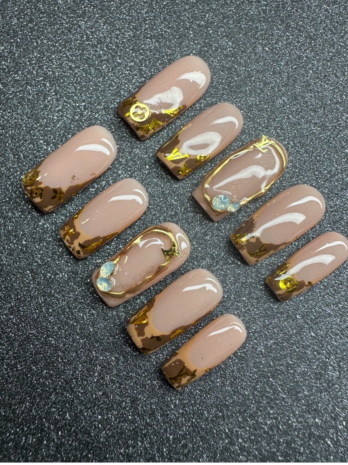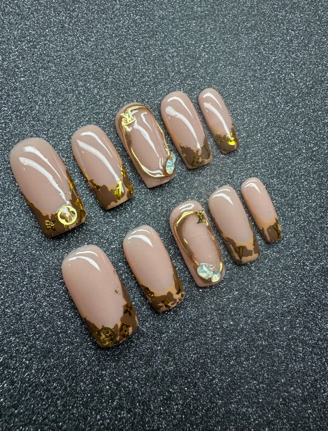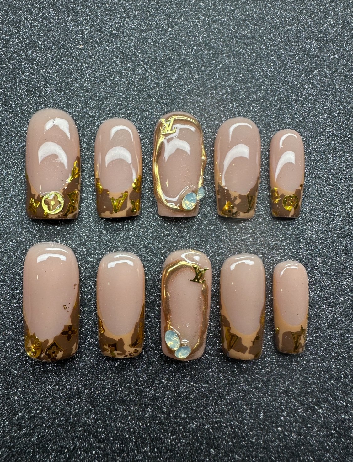 This rich nude and chocolate brown set is accented with gold foil, luxe LV decals, and opal gems—perfect for glam lovers who want designer vibes at their fingertips.
