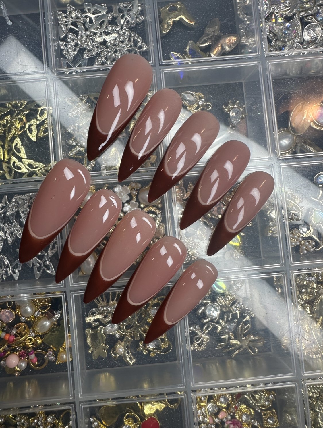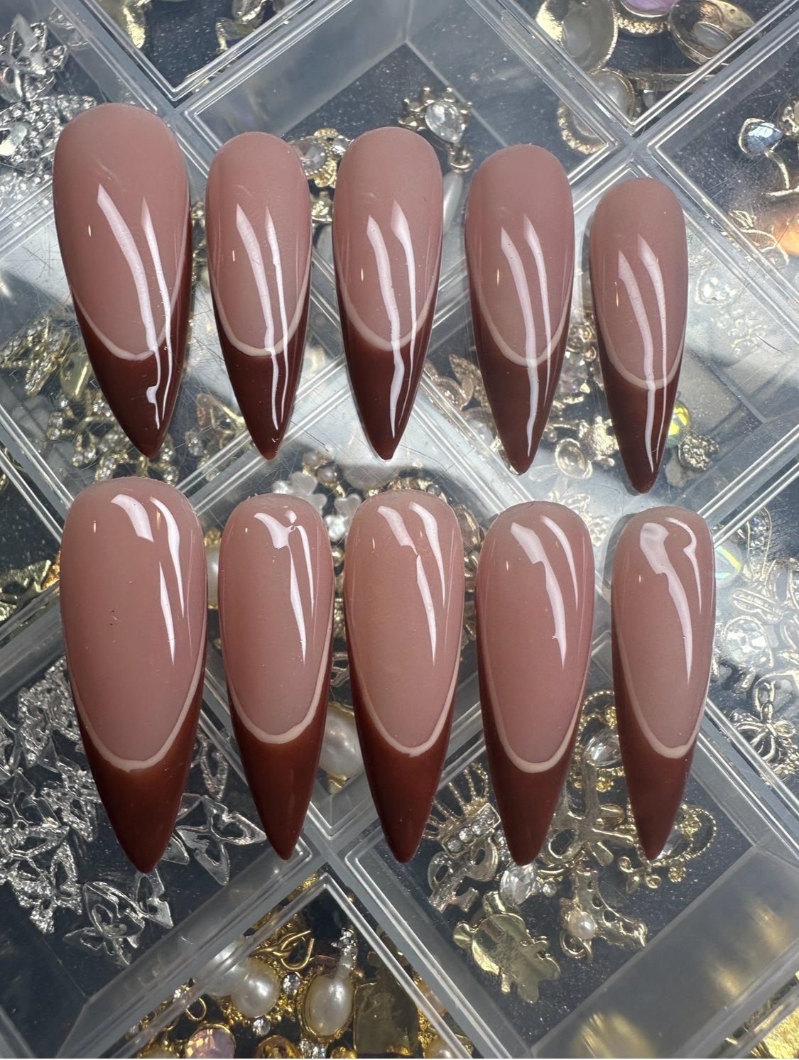 This sophisticated stiletto nail set features a smooth gradient from a warm nude base to a deep mocha brown tip, finished with a glossy shine and sleek swooping detail for added depth and elegance. Perfect for a chic, minimalist look with a bold edge.