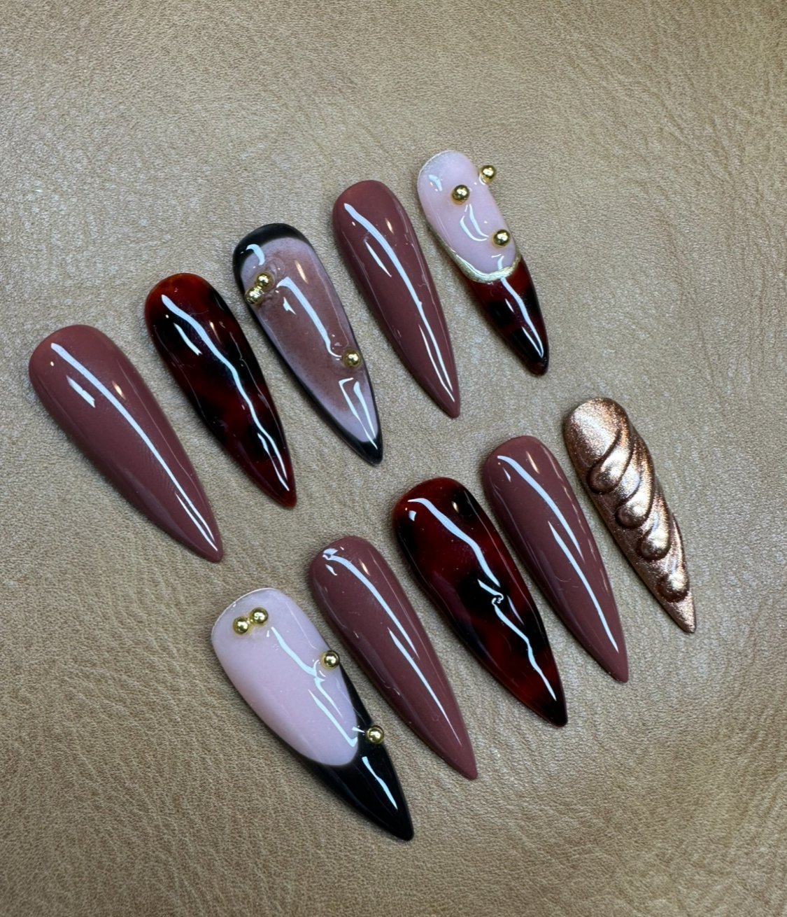 A bold mix of deep mocha tones, tortoise shell accents, and touches of gold with a shimmering sculpted nail the perfect balance of elegance and edge