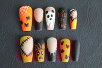 playful Halloween press-on collection featuring cobwebs, stitches, pumpkins, ghosts, and Mickey-inspired spooky silhouettes in bold orange, black, and nude tones. Perfect for a festive and fun October look