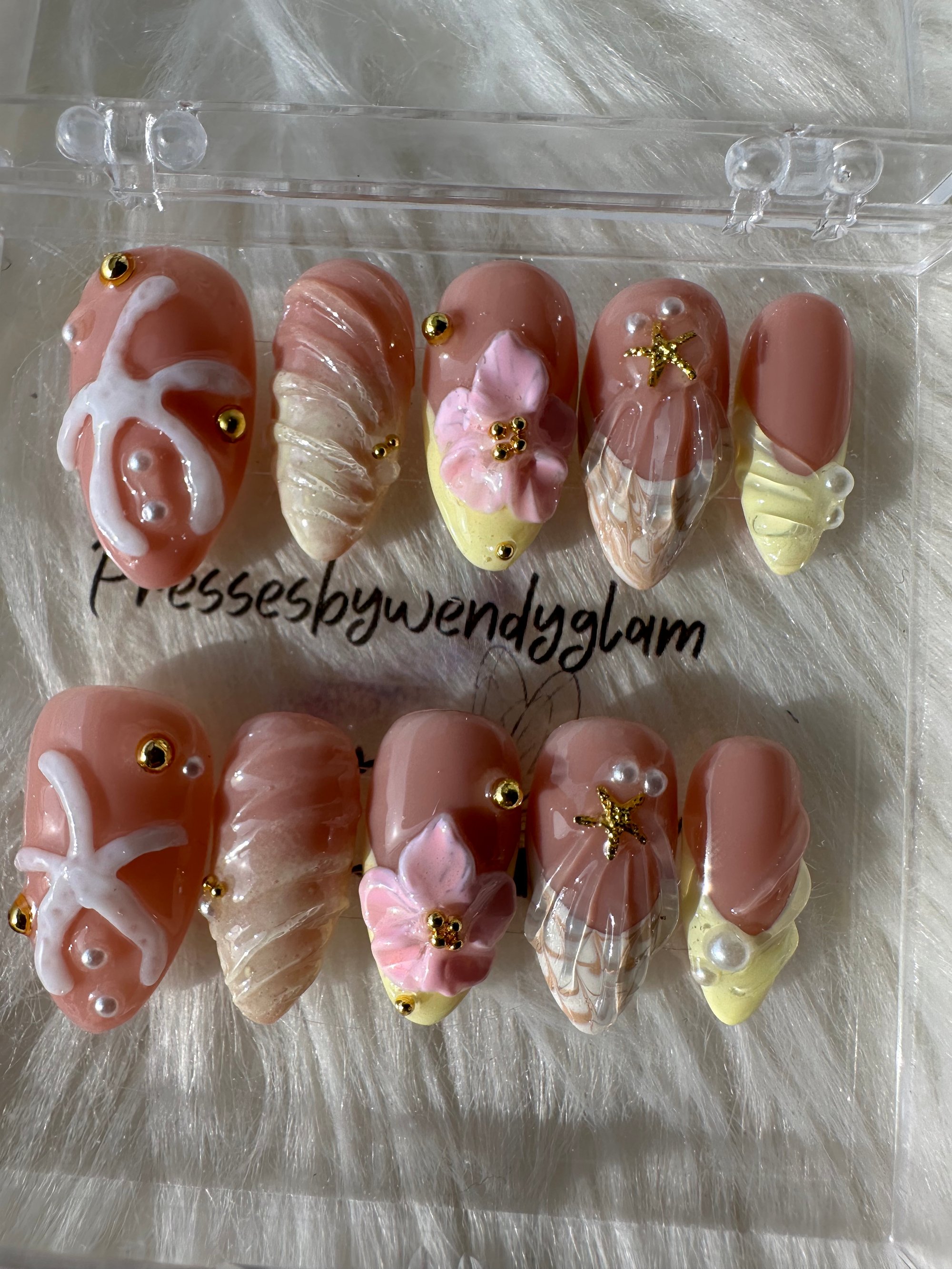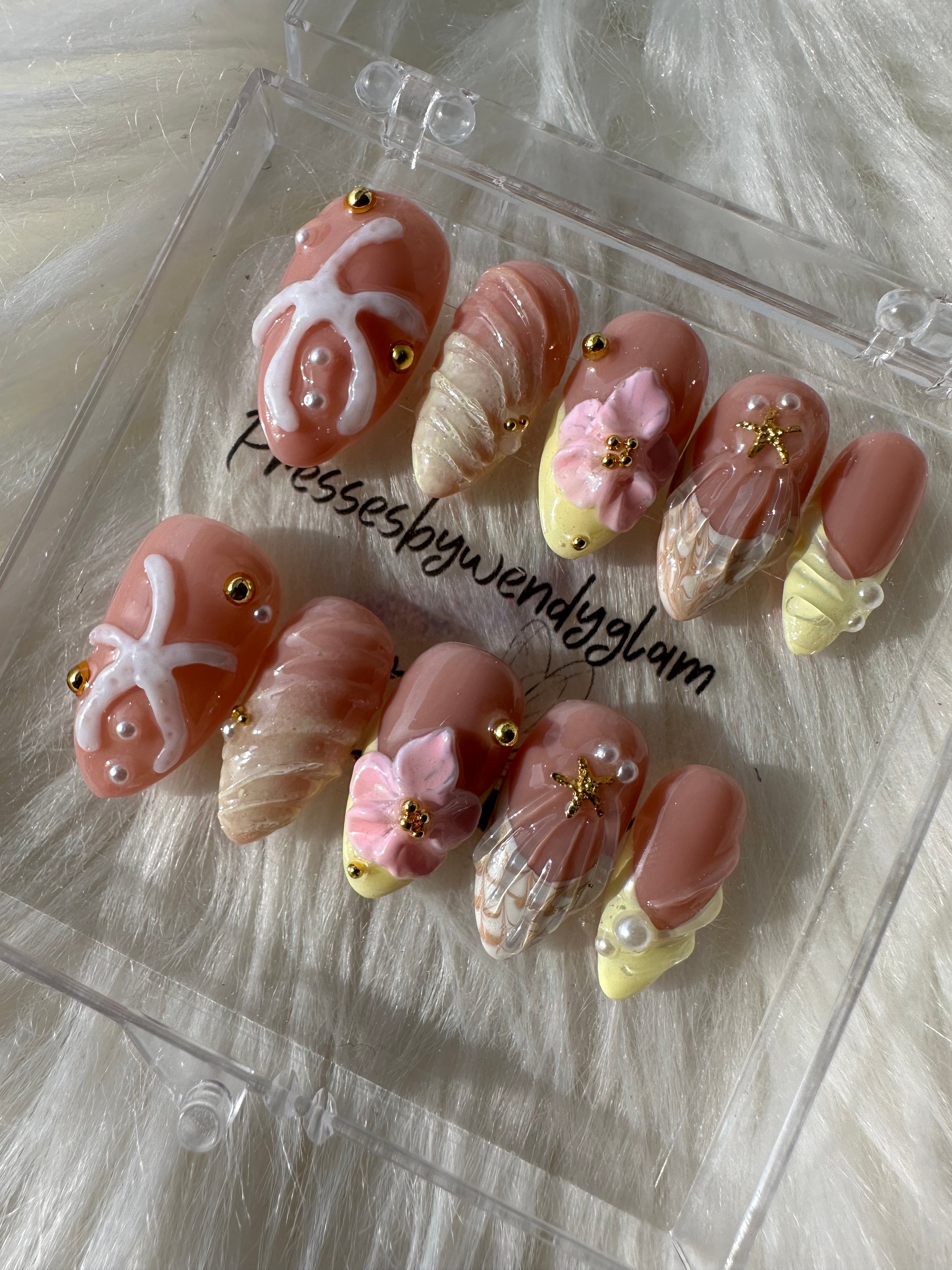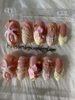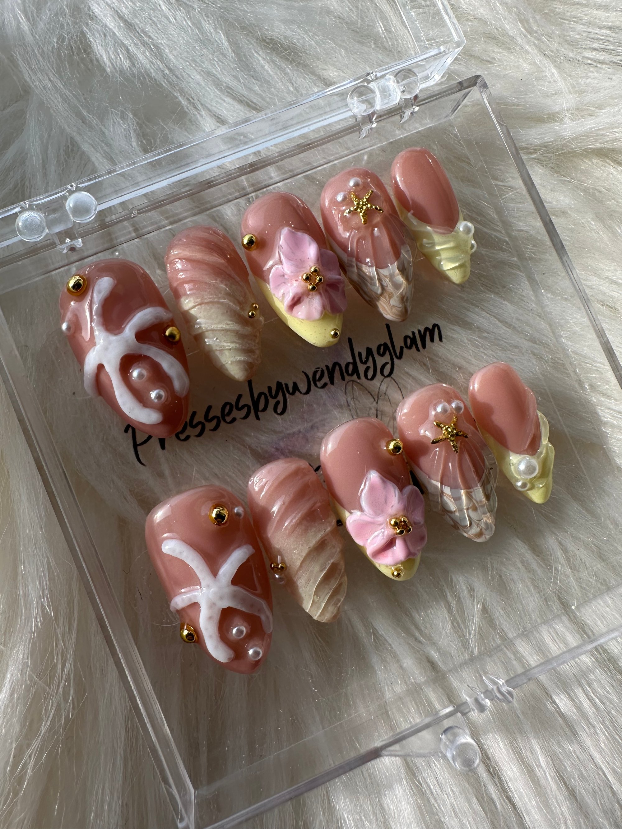 Soft peachy-nude press-ons with dreamy 3D florals, pearl accents, seashell textures, and subtle gold details. A delicate coastal glam set perfect for spring and beachy vibes