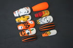 A playful Halloween press-on set inspired by the Peanuts gang, featuring Snoopy, Charlie Brown, Woodstock, pumpkins, ghosts, and bold orange and black stripes perfect for fall vibes and spooky season fun