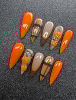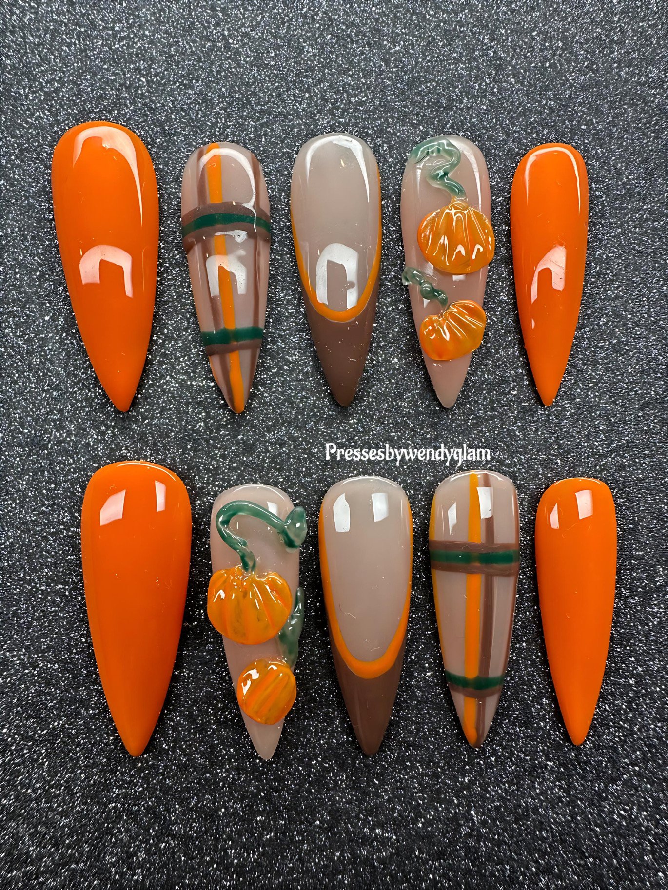Embrace cozy fall vibes with Pumpkin Spice a festive press-on nail set that blends bold seasonal orange, earthy browns, and neutral taupes. Featuring 3D pumpkin accents, deep green plaid stripes, and a sleek French tip twist, this design captures the essence of pumpkin patches, crisp air, and warm lattes. Perfect for autumn lovers who want a playful yet stylish look that screams fall glam