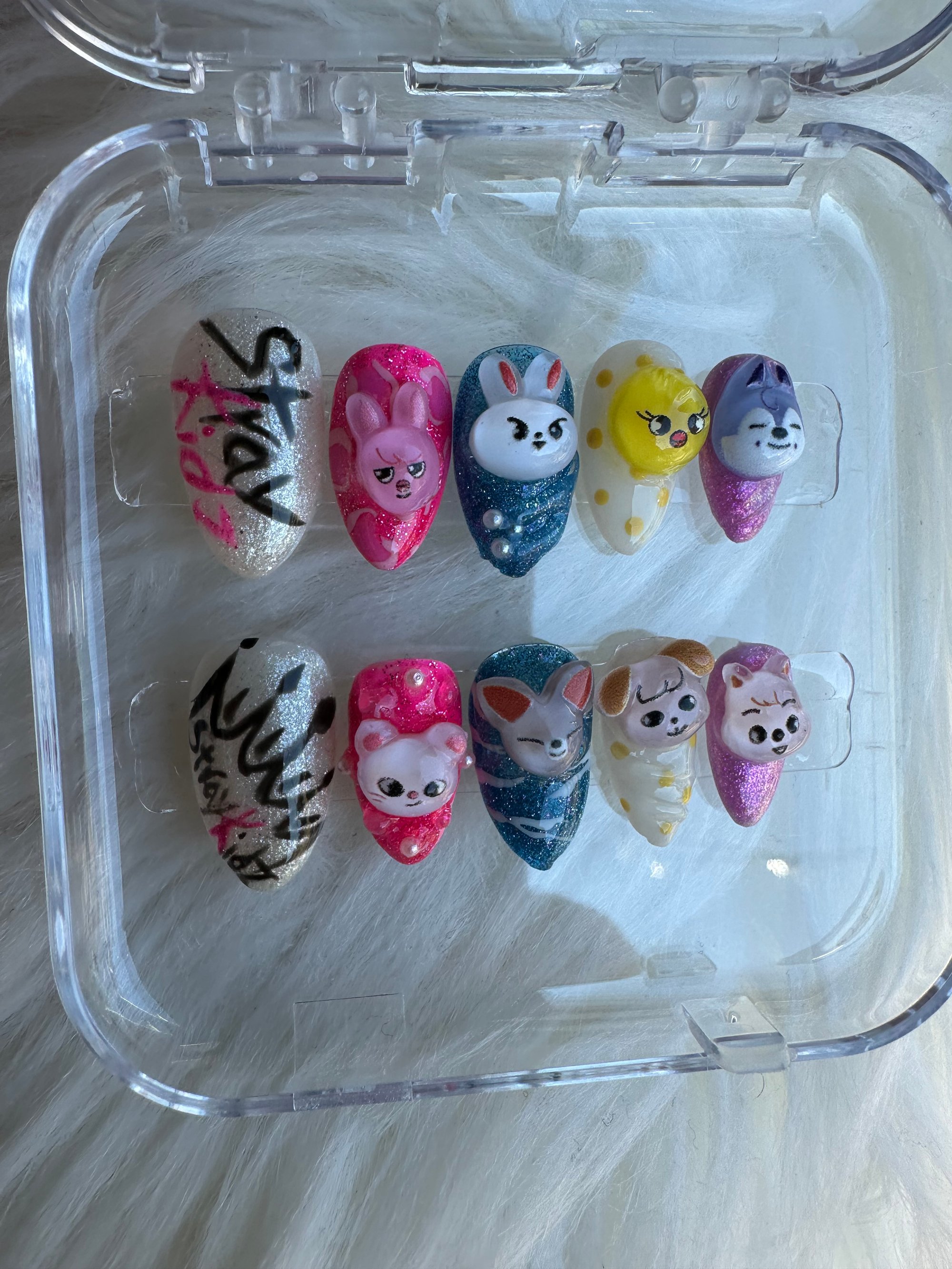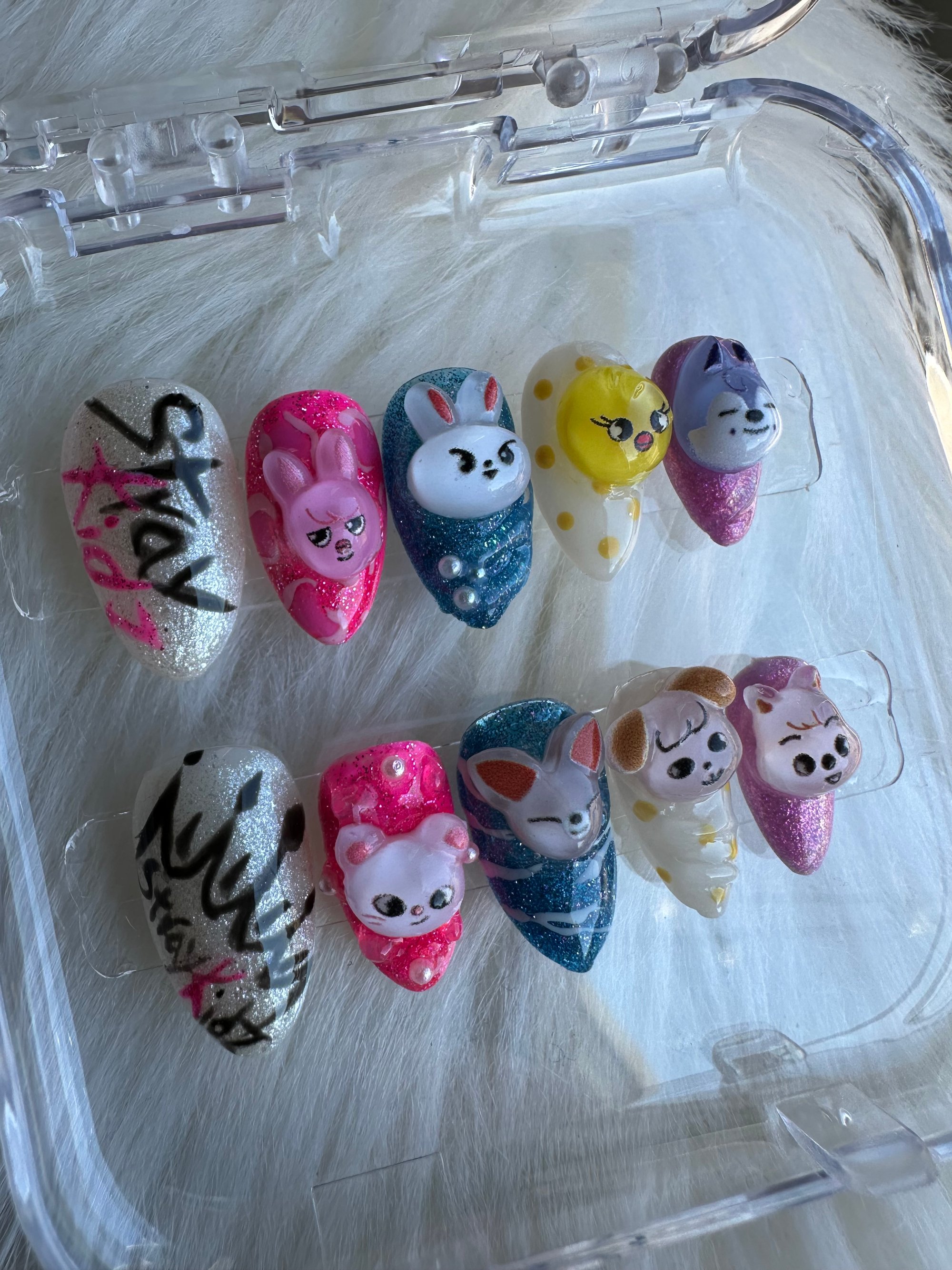 Inspired by Stray Kids’ SKZOO characters playful animal designs with bold colors and sparkly attitude.