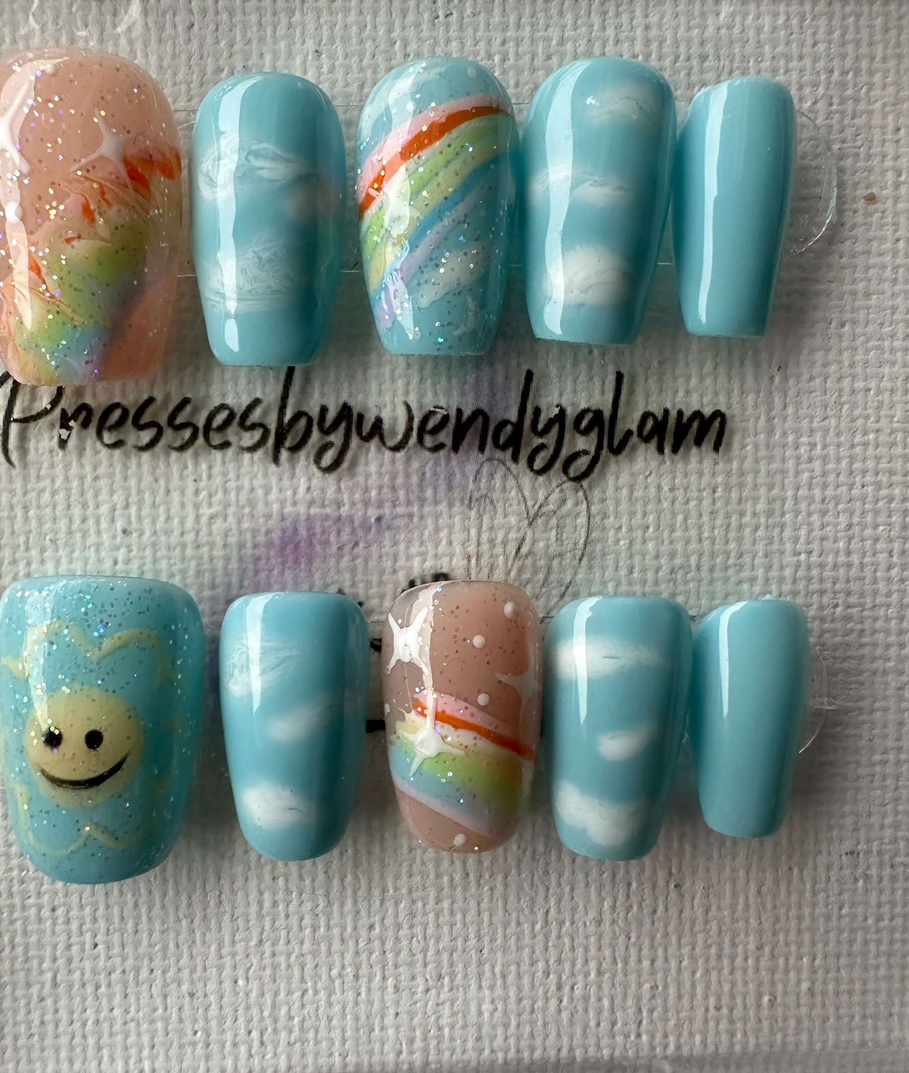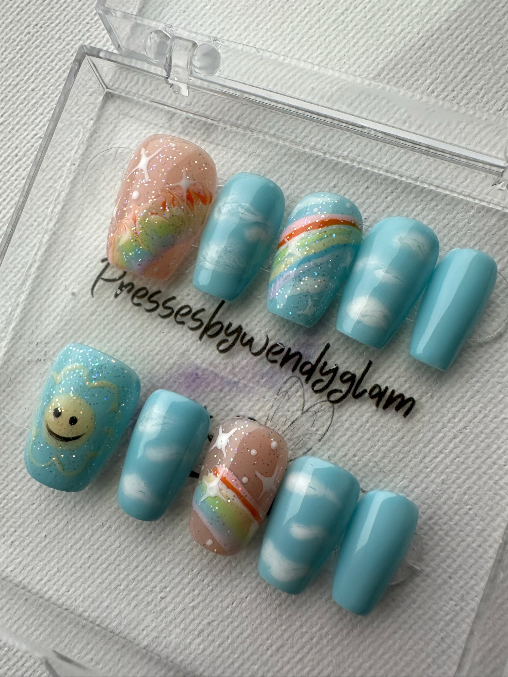 A soft sky-blue press-on set with fluffy cloud accents, pastel rainbow swirls, and a cute smiley face for a playful pop. Sweet, cheerful, and perfect for spring days, little adventures, and happy vibes all around.