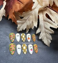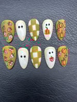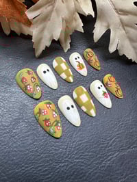 A cozy mix of fall and Halloween charm. Featuring hand-painted designs including whimsical ghosts, mini pumpkins, strawberries, and a bold olive gingham pattern — this set brings cottagecore meets spooky season vibes. Perfect for autumn lovers who want a cute, playful look without sacrificing comfort or style. Matte finish for that soft-touch feel