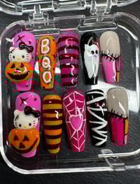 A fun mix of Halloween cuteness and glam featuring Hello Kitty with pumpkins, pink spider webs, bold stripes, mummies, and stitched spooky details. Perfect for anyone who loves a playful yet fierce Halloween vibe
