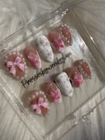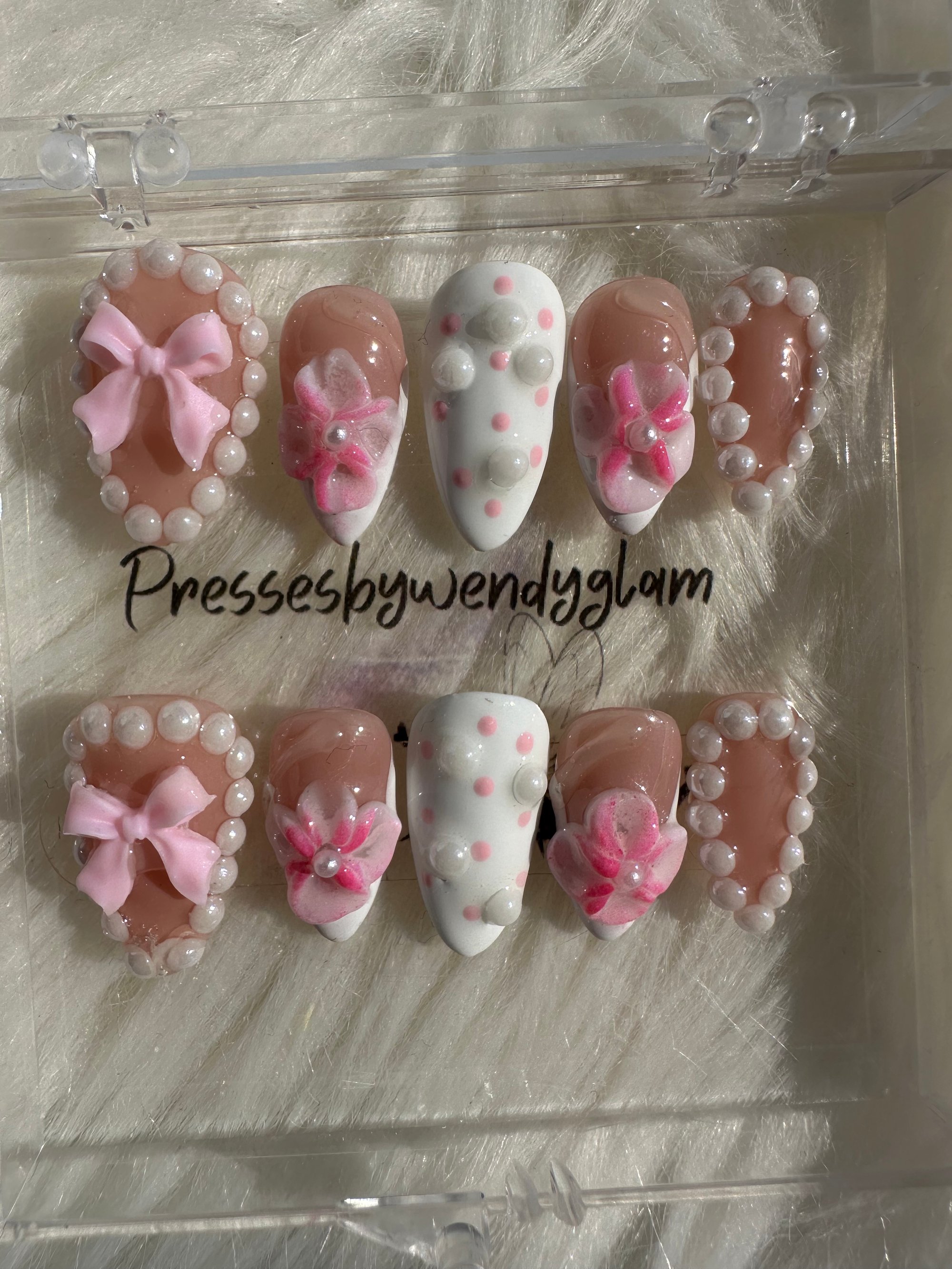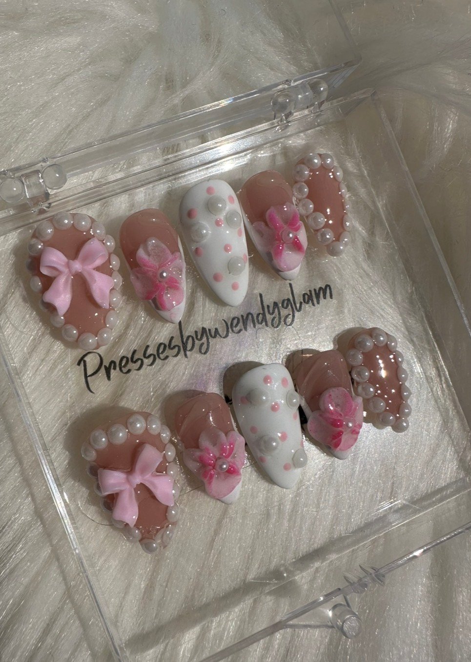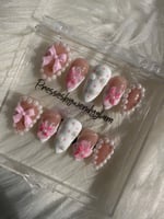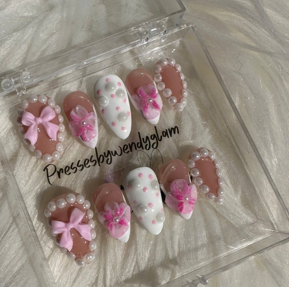 This soft, feminine press-on set features glossy nude and milky white tones adorned with delicate pink bows, dainty 3D florals, and elegant pearl accents. Finished with subtle polka dots and a high-shine glaze, this set gives a sweet, romantic, and classy vibe perfect for special occasions, bridal moments, or anyone who loves a timeless girly aesthetic.
