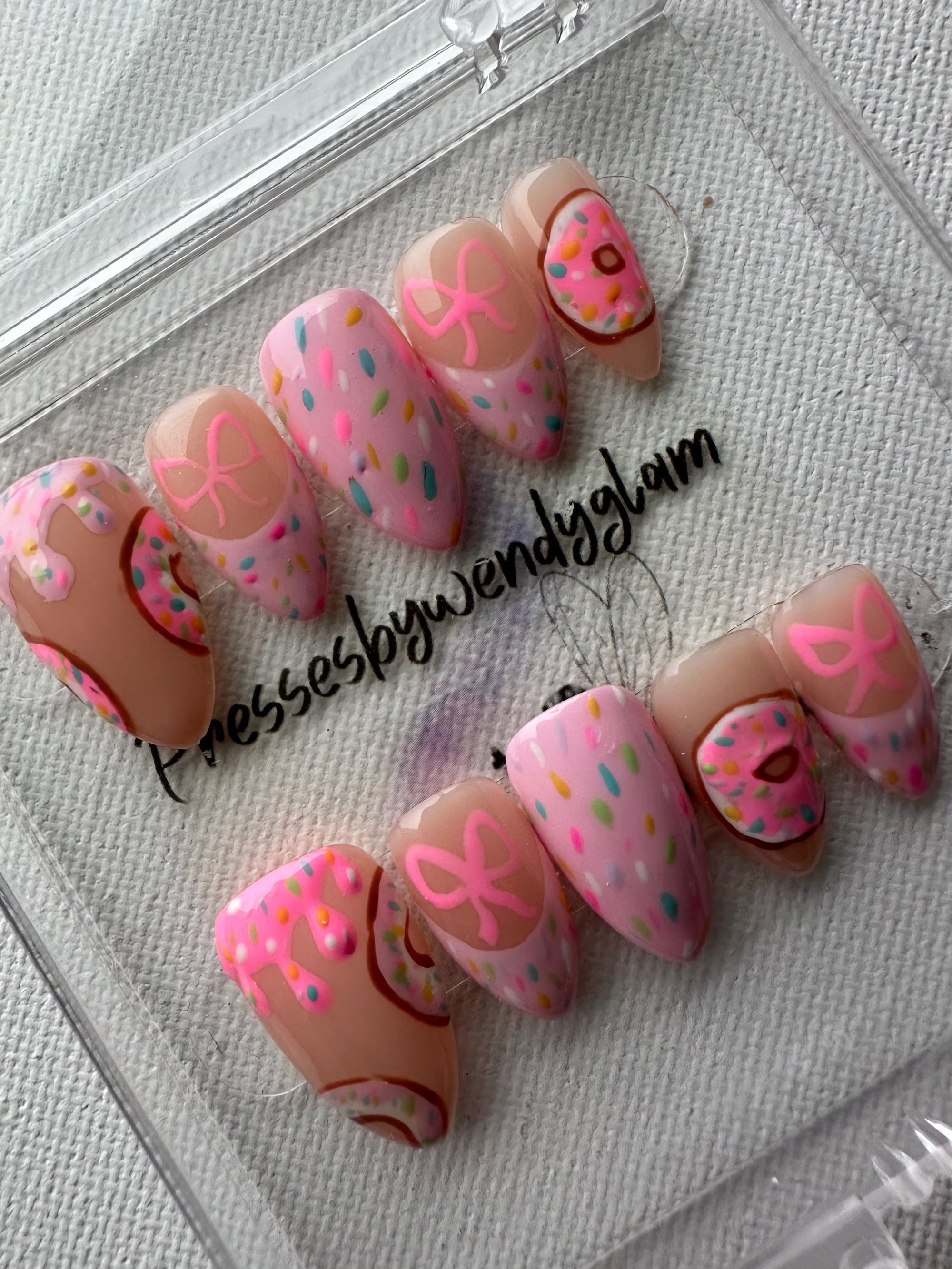 Soft pink and nude nails topped with colorful sprinkle dots, cute bows, and donut-inspired accents sweet, playful, and perfect for kids who love fun candy vibes.