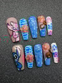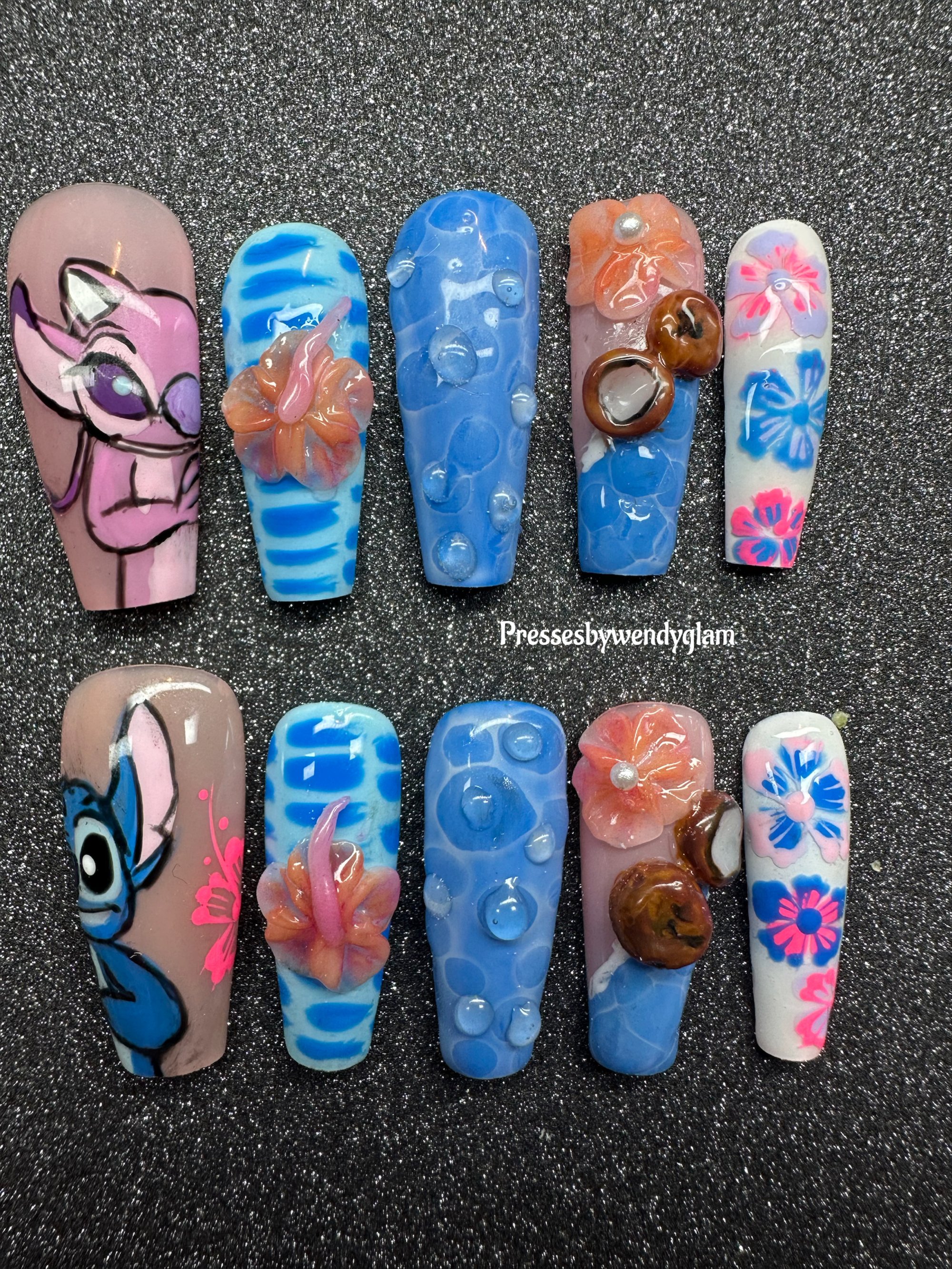 Bring island vibes to your fingertips with this adorable Stitch and Angel press-on set! Featuring hand-painted characters, tropical florals, and ocean-inspired details — it’s the perfect mix of cute and beachy.