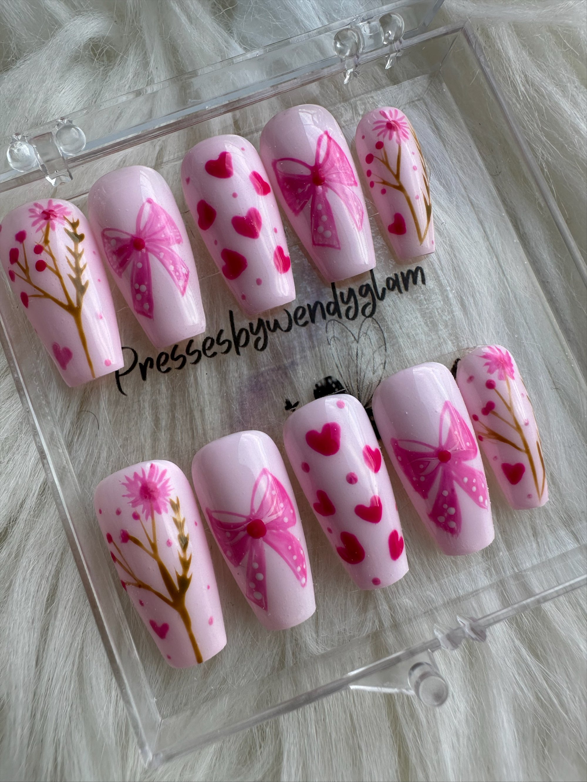 Soft blush pink with hand-painted bows, dainty florals, and scattered hearts for a cute, romantic Valentine vibe