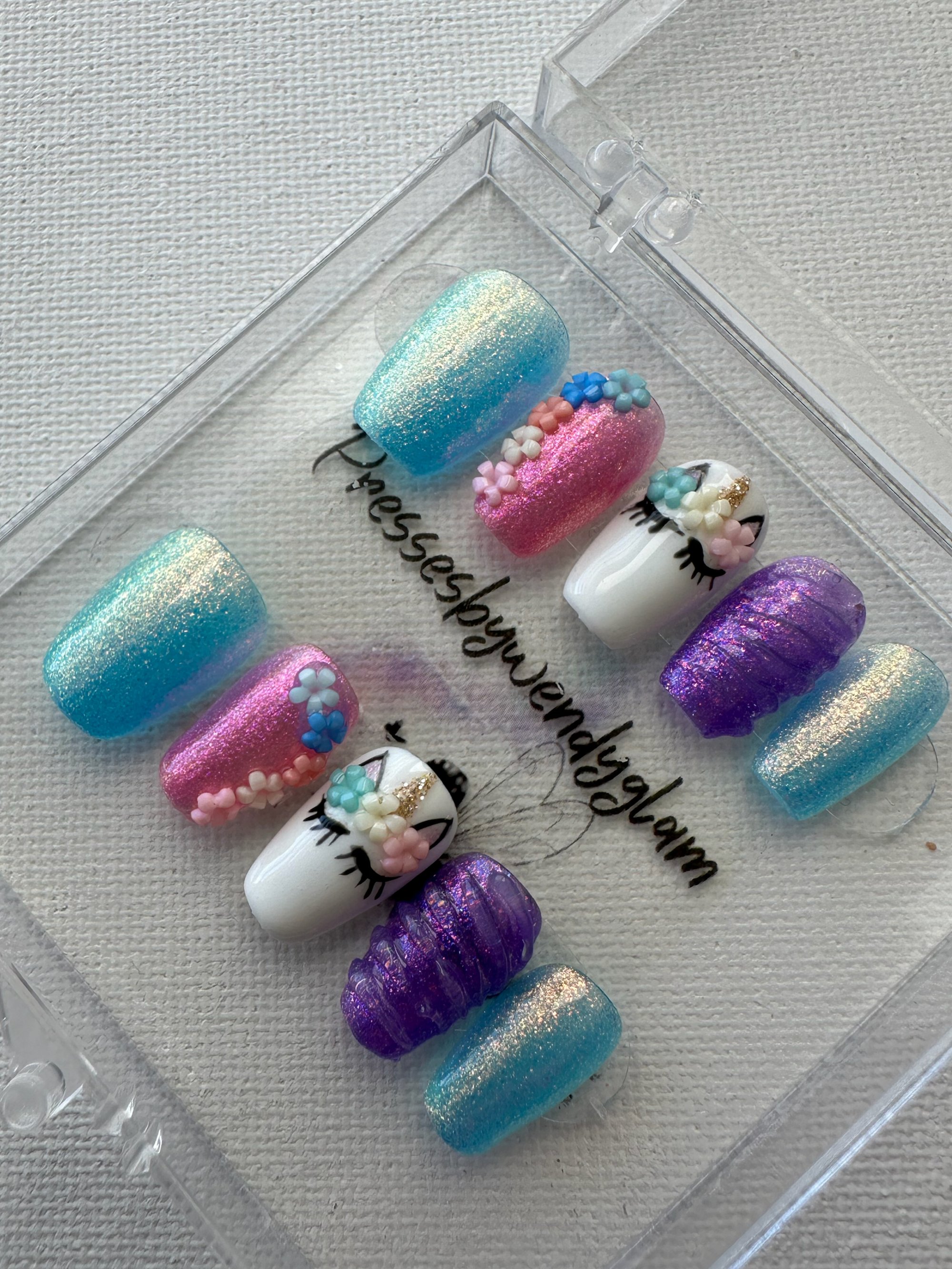 A magical unicorn-inspired nail set with pastel rainbow colors, glittery sparkle, cute flowers, and a sweet unicorn-dreamy design. Perfect for kids who love unicorns, magic, and all things fun and colorful!