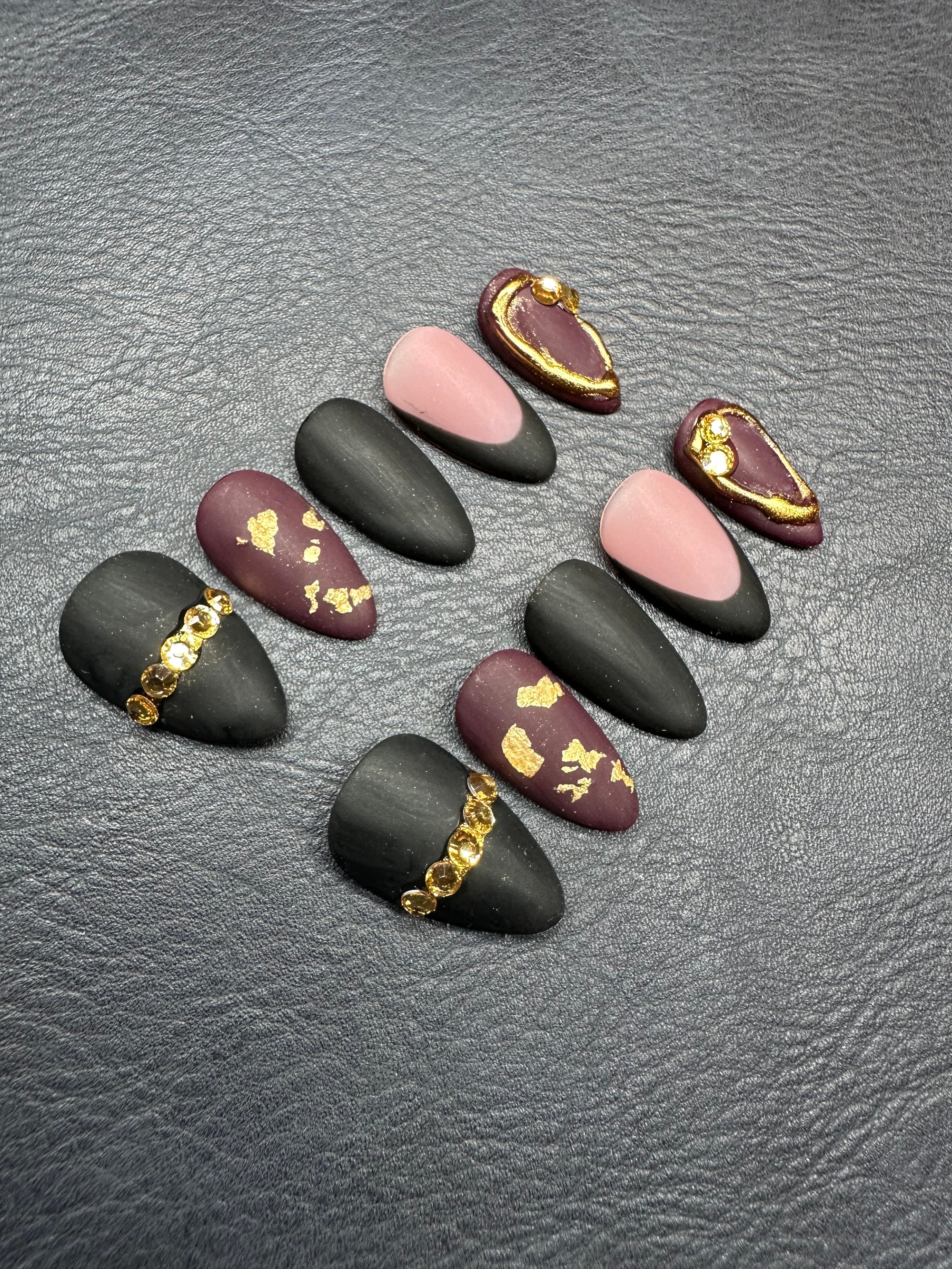 captures the cozy richness of fall with deep matte black, burgundy wine, and soft mauve tones. Embellished with gold foil, crystal bands, and elegant gold rim this set blends luxury and warmth. Perfect for sweater weather season, candle-lit dinners, and golden hour vibes.
