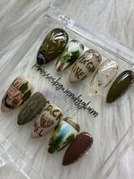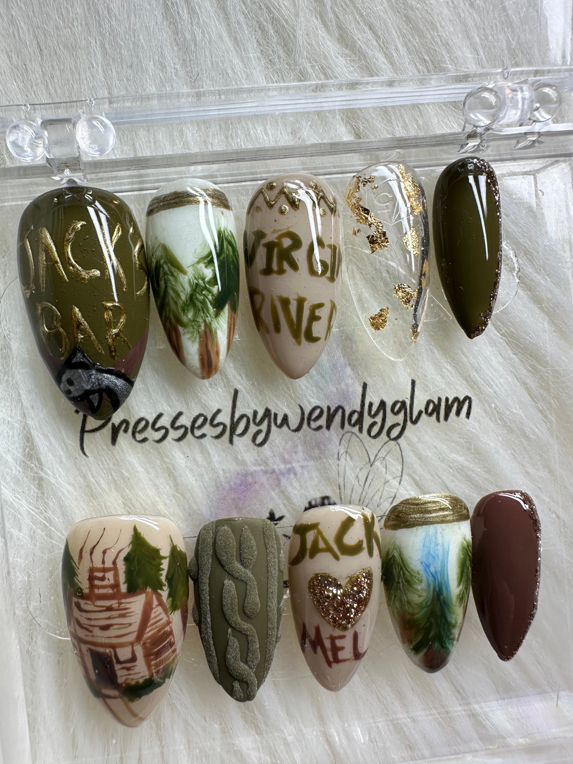 Inspired by the cozy, small-town charm of Virgin River, this press-on set features earthy olive, warm nude, and deep mocha tones with hand-painted forest scenes, rustic cabin details, and soft marbled accents. Subtle gold foil and textured sweater elements add a touch of warmth and romance perfect for lovers of nature, heartfelt moments, and cozy countryside vibes.