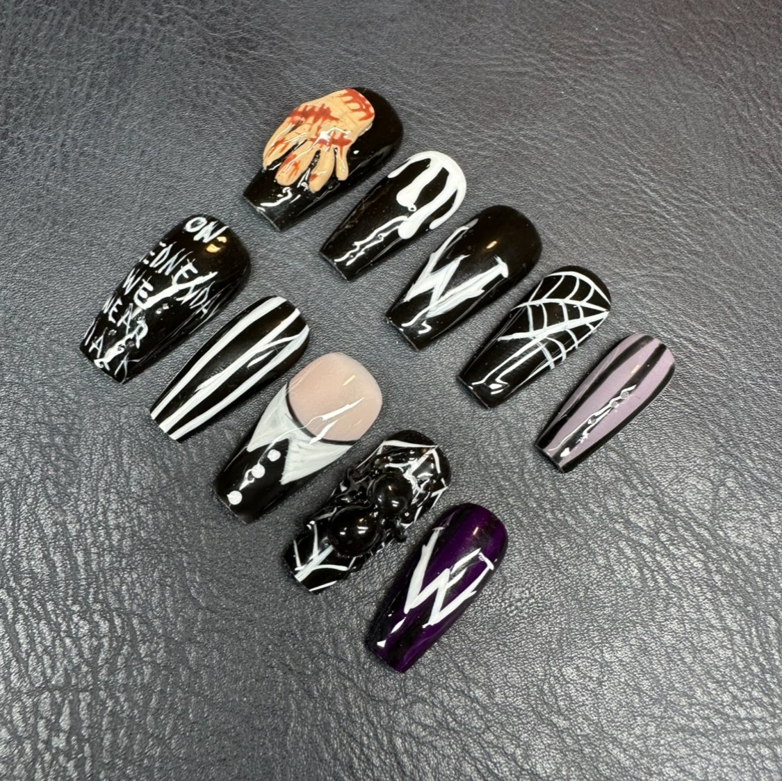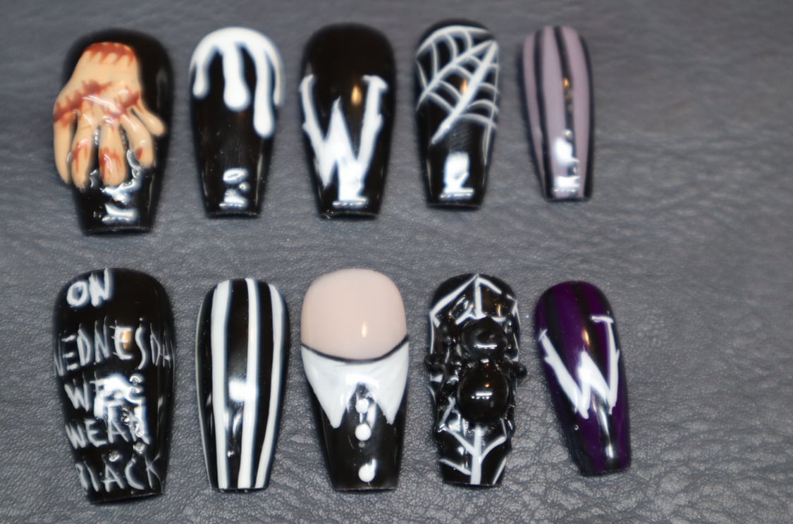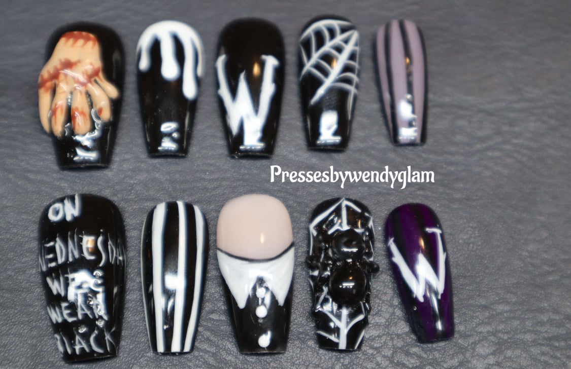 Step into the dark, stylish world of Wednesday Addams with this spooky-chic press-on nail set. Featuring 10 unique designs, each nail captures elements from the hit Wednesday series from a 3D sculpt of Thing and gothic spiderwebs to her iconic white-collared outfit and the quote βOn Wednesdays We Wear Black.β With a dramatic black, white, and deep purple palette, these nails are perfect for horror lovers, Halloween vibes, or adding a mysterious edge to your everyday look