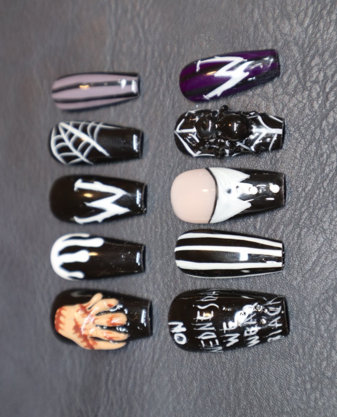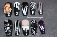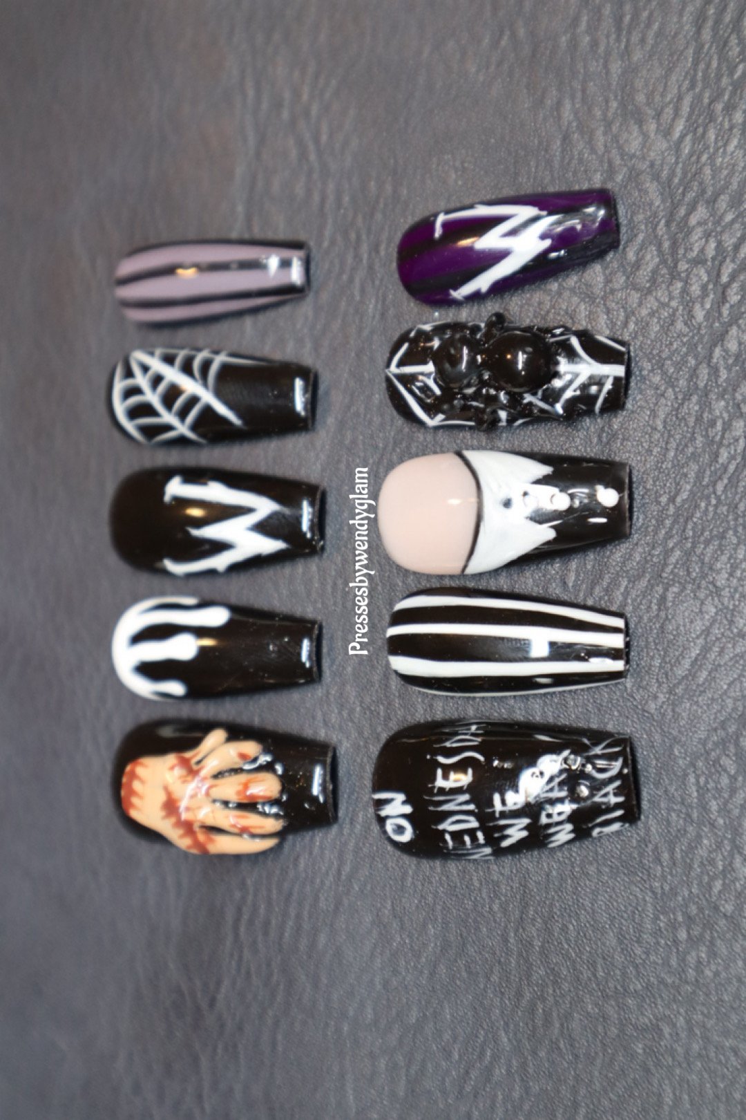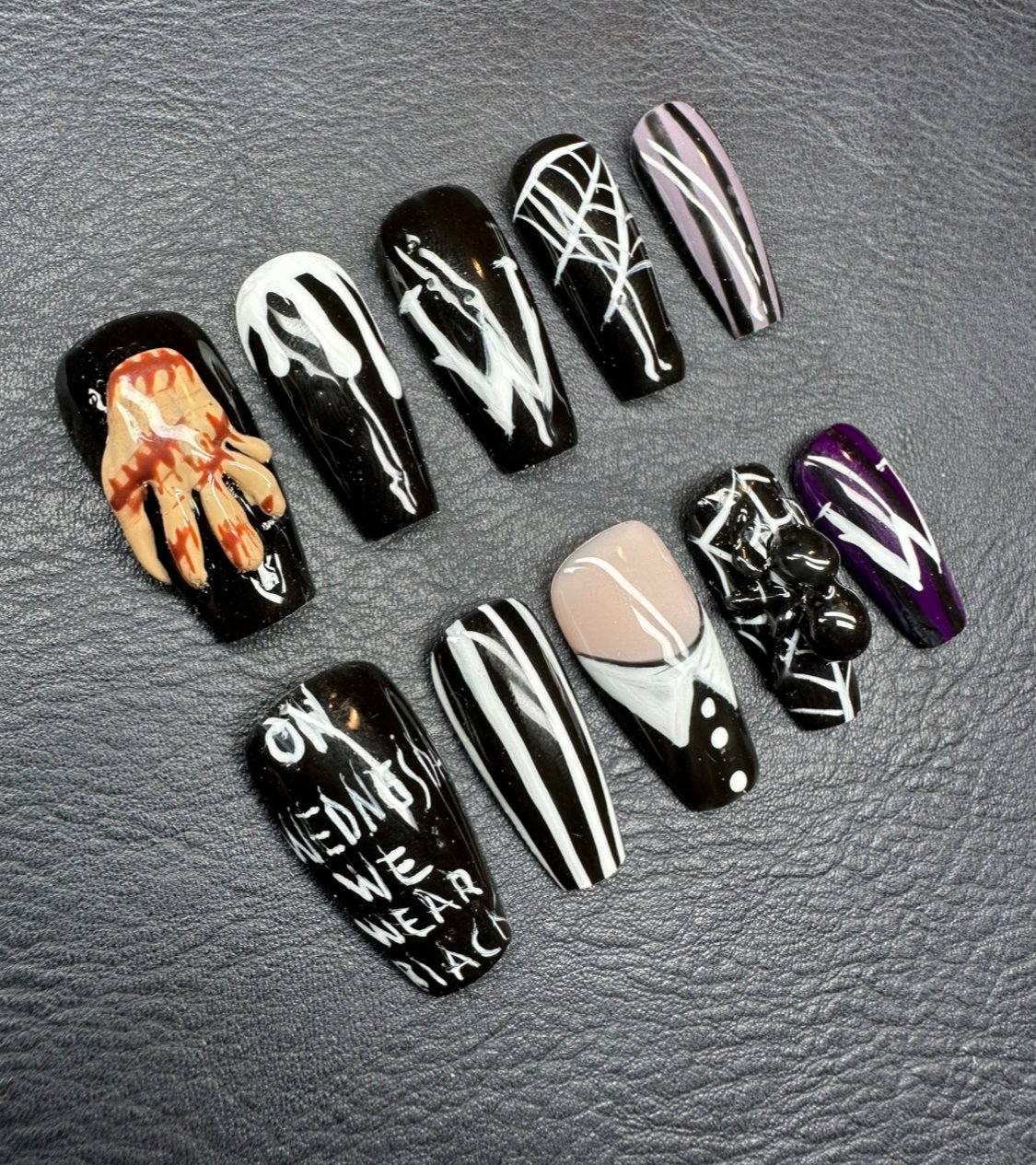 Step into the dark, stylish world of Wednesday Addams with this spooky-chic press-on nail set. Featuring 10 unique designs, each nail captures elements from the hit Wednesday series from a 3D sculpt of Thing and gothic spiderwebs to her iconic white-collared outfit and the quote βOn Wednesdays We Wear Black.β With a dramatic black, white, and deep purple palette, these nails are perfect for horror lovers, Halloween vibes, or adding a mysterious edge to your everyday look
