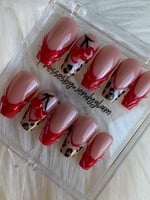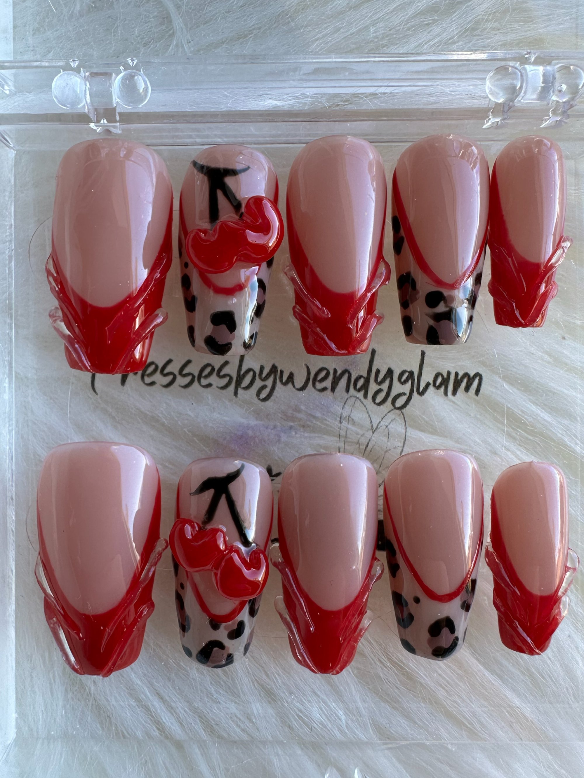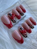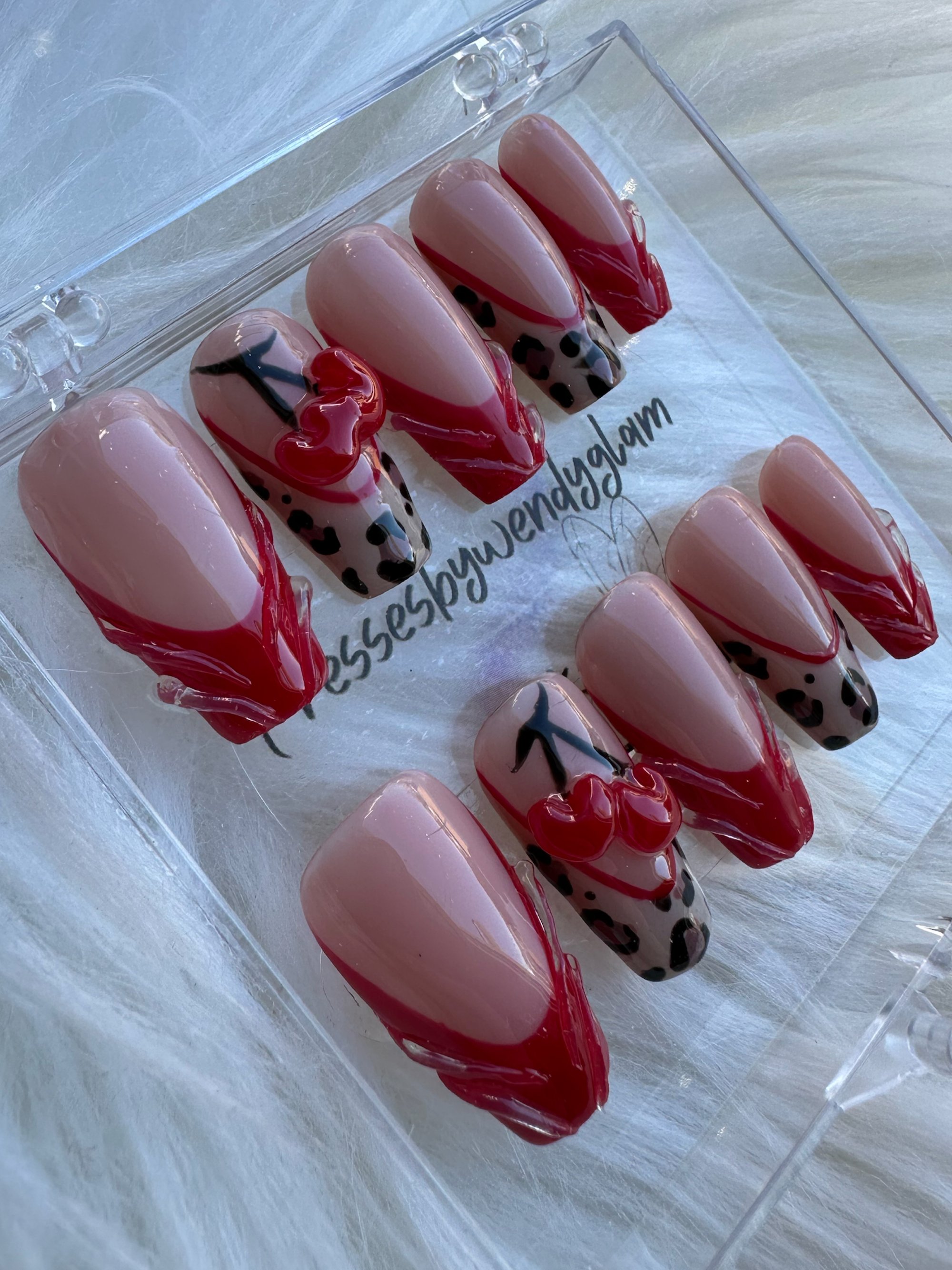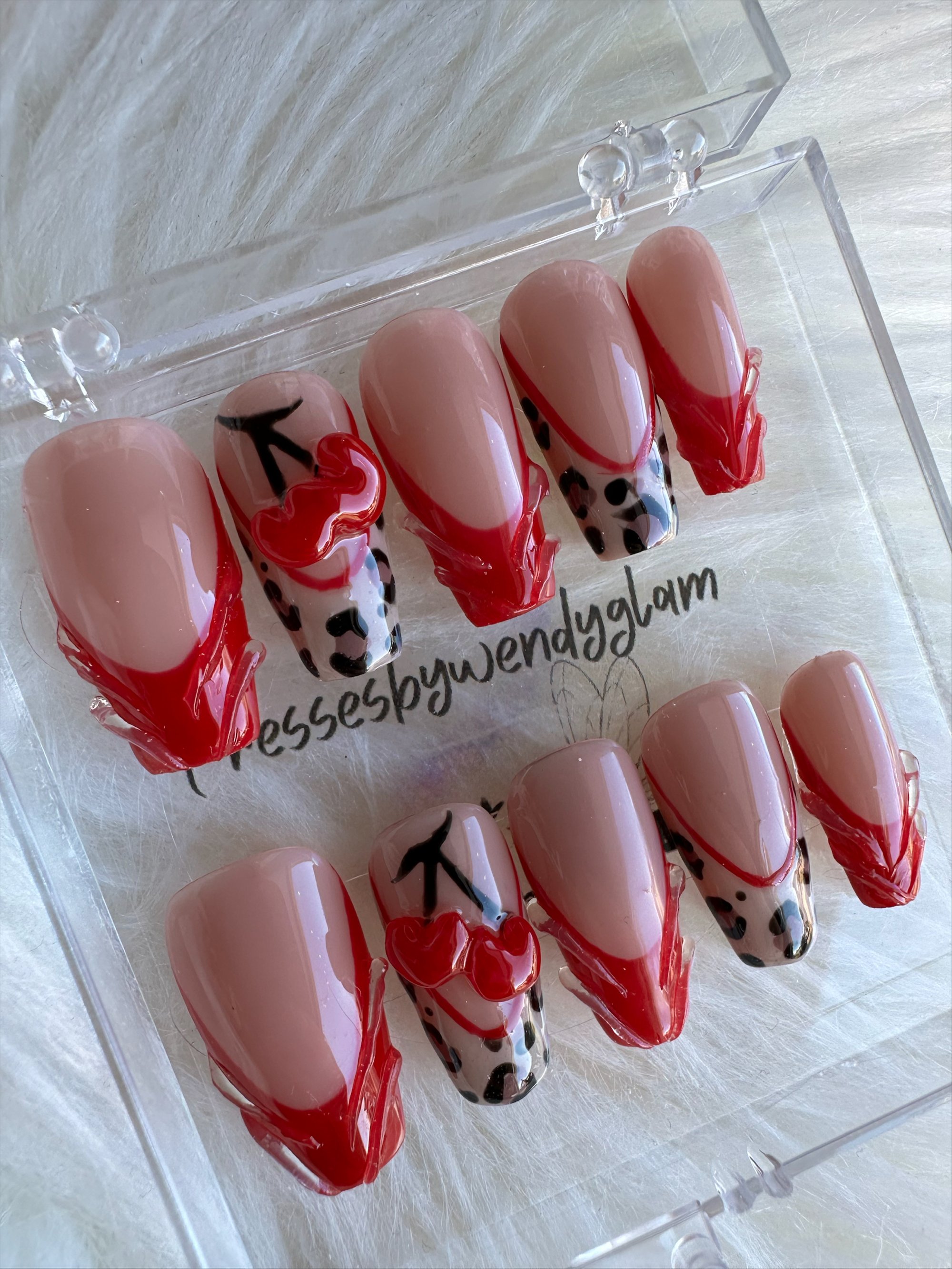 Sweet meets savage with a nude base, red sculpted details, black leopard spots, and glossy cherry hearts.